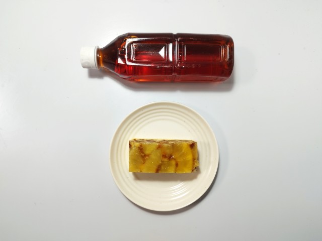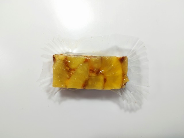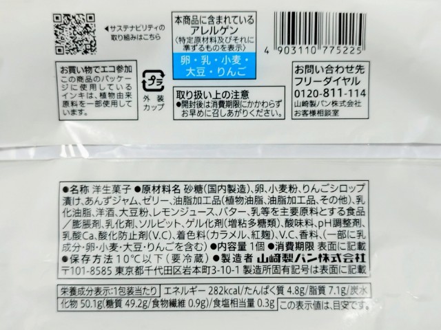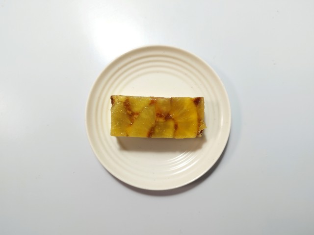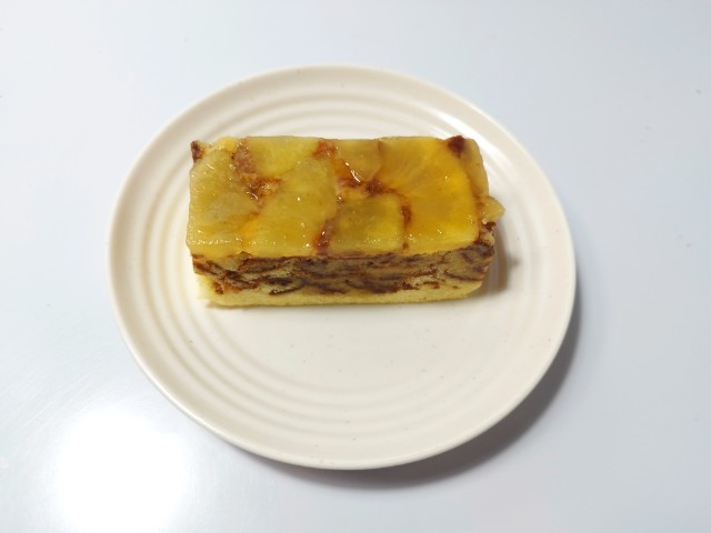 りんごを使ったずっしりケーキです。ずっしりケーキの言葉に惹かれて買ってみた商品で、個人的には楽しみにしていた新商品の一つでもあります。そんなずっしりケーキですが、上からりんごのシロップ漬け、ケーキ生地、スポンジ生地の層で構成されていて、りんごのシロップ漬けはシャキシャキとした食感とりんごの甘味で、ハマってしまう美味しさです。中央のケーキ生地はしっとりとした食感と洋酒の風味、ほどよい甘味があって、りんごのシロップ漬けともよく合います。スポンジ生地はふんわりとした食感とくちどけの良さで、食感のアクセントになっています。ずっしりケーキの言葉通り、ずっしりとした重みのケーキは食べ応えがあって、食べた後の満足度も高いと思います。大きさは手のひらサイズくらいで、おやつや食後のデザートにピッタリです。ぜひずっしりケーキを食べてみてください。