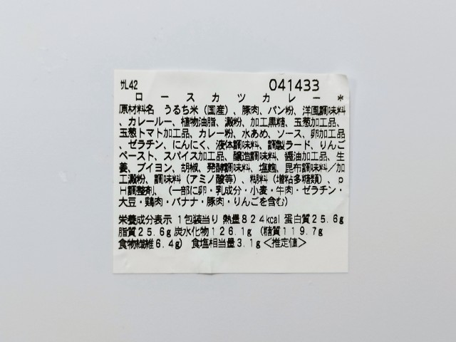 熱量:824kcal、たんぱく質:25.6g、脂質:25.6g、炭水化物:126.1g(糖質:119.7g、食物繊維:6.4g)、食塩相当量:3.1g