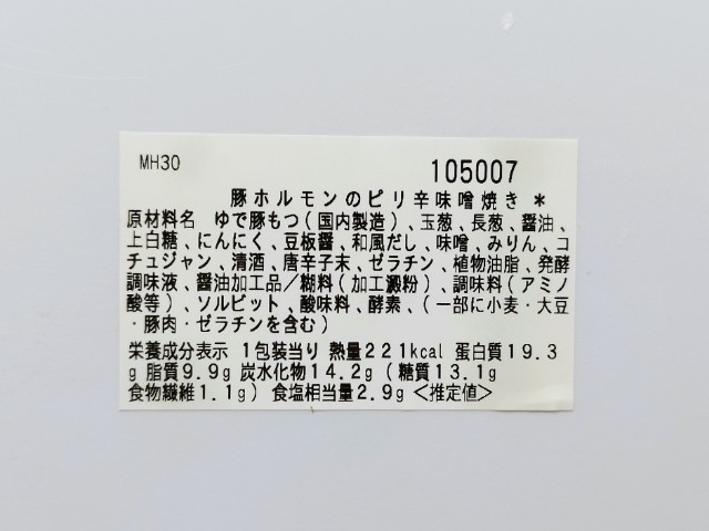 豚ホルモンのピリ辛味噌焼きです。商品名から美味しいイメージしかなく、思わず手に取ってしまいました。そんな豚ホルモンのピリ辛味噌焼きですが、豚ホルモンはプルンとした食感とジューシーな脂で、ハマってしまう美味しさです。味付けであるピリ辛味噌ダレは味噌のコクと唐辛子のピリリとした辛味、にんにくの風味があって、豚ホルモンとの相性抜群です。ピリ辛味噌ダレが濃厚な味わいなので、豚ホルモンの臭みというのもほとんど感じず、かなり食べやすいです。今回はそのまま食べましたが、温かいご飯の上にのせて丼物として食べても美味しいと思います。内容量は一人分にちょうどよく、ご飯のおかずやお酒のお供にピッタリです。ぜひ豚ホルモンのピリ辛味噌焼きを食べてみてください。