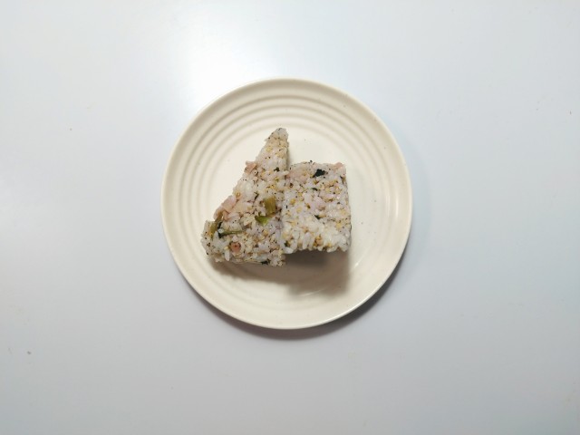 梅しそ大根と野沢菜・赤しそふりかけ・白ごまを旨だしで炊いたごはんに混ぜ込んだ大きなおにぎり。色味豊かで春を感じられる仕立て。