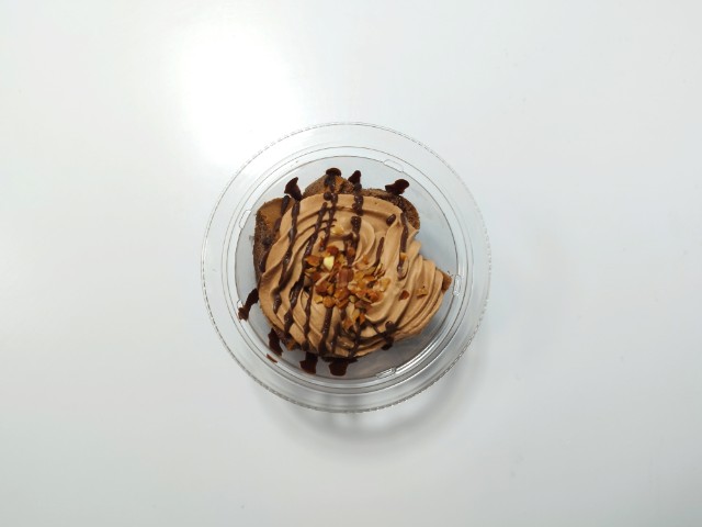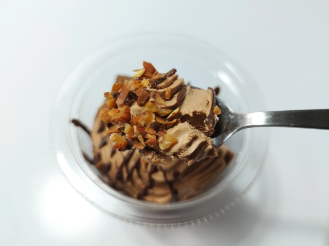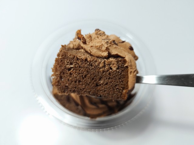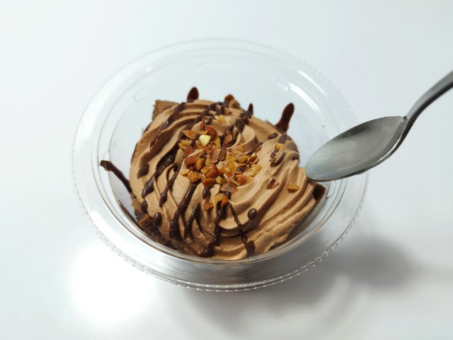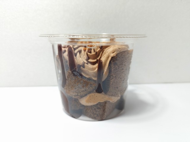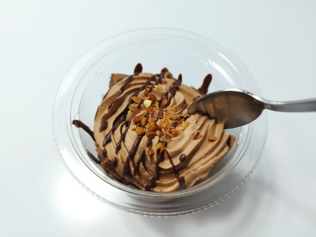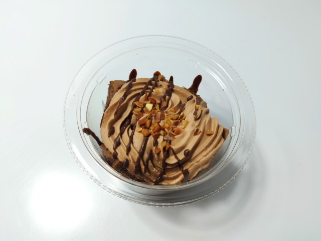 チョコホイップクリームとココアシフォンケーキを使ったスイーツです。見つけた瞬間に手に取ってしまった商品で、個人的には楽しみにしていた新商品の一つでもあります。そんなパリパリ食感ショコラシフォンですが、チョコホイップクリームの下にココアシフォンケーキ、またその下にチョコホイップクリーム、底にココアシフォンケーキと綺麗に分かれているスイーツで、そこそこ高さがあります。チョコホイップクリームはなめらかな食感とチョコの甘みで、食べ出すと止まらなくなる美味しさです。ココアシフォンケーキはしっとりとした食感とココアの風味、くちどけの良さがあって、チョコホイップクリームともよく合います。ポイントはトッピングのクラッシュアーモンドとチョコの線掛けで、特にチョコの線掛けはパリパリとした食感とチョコの甘みがあって、最後のひと口まで飽きることなく食べられます。内容量は一人分にちょうどよく、おやつや食後のデザートにオススメです。ぜひパリパリ食感ショコラシフォンを食べてみてください。