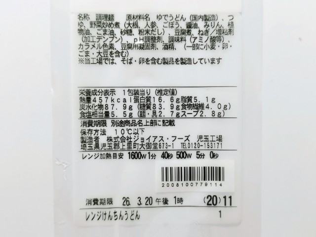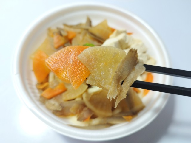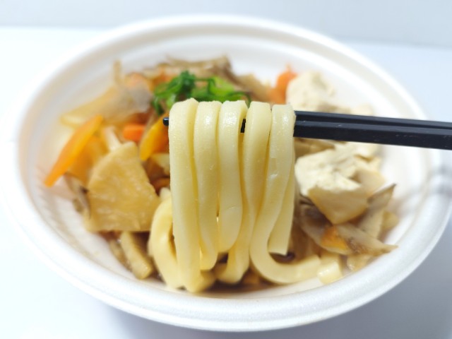 具だくさんけんちんうどんです。以前に【関東の一部】茨城県産大根使用 みそけんちんうどん(2025年10月21日発売)がありましたが、今回は醤油ベースのつゆになっています。そんなけんちんうどんですが、つゆ鰹だしの旨味醤油の風味野菜の甘味で、飲み干してしまいたくなる美味しさです。うどん小麦の風味しっかりとしたコシがあって、食べ応え抜群です。ポイントはやはりたっぷりの具材で、大根人参ごぼうを使った野菜煮を始め、木綿豆腐ねぎがのっていて、それぞれの味や食感を楽しむ事が出来ます。今回はそのまま食べましたが、七味唐辛子おろし生姜などでアレンジしながら食べても美味しいと思います。内容量は1食分にちょうどよく、お腹も満たされます。ぜひ具だくさんけんちんうどんを食べてみてください。