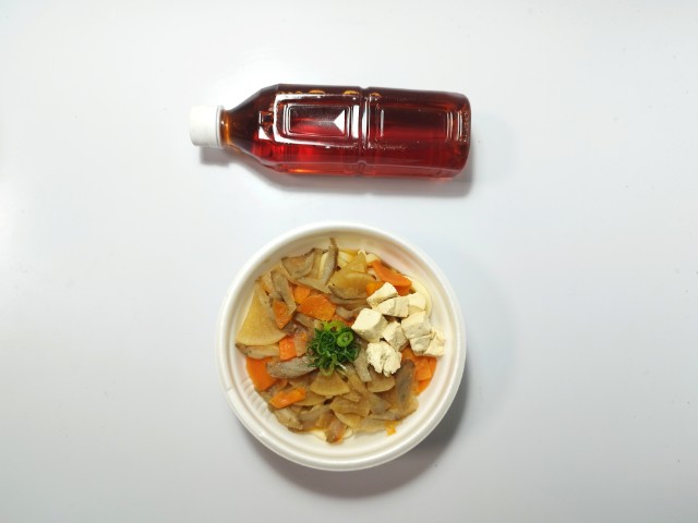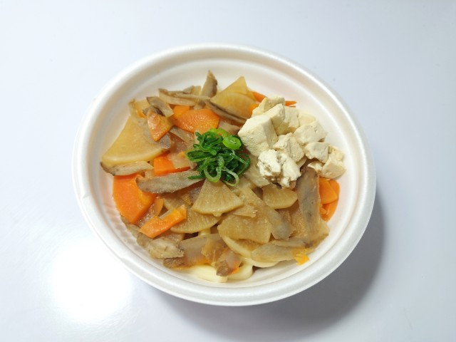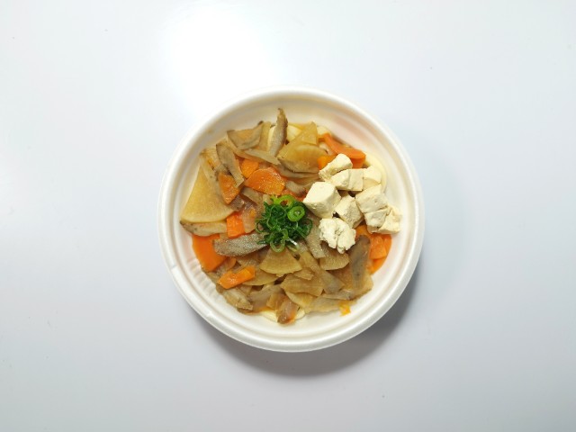かつお節のだしと醤油の返しで仕立てたつゆに、小麦の風味と弾力が特徴の太めのうどんを合わせました。大根、人参、ごぼうを使用した野菜煮と木綿豆腐、ねぎをトッピングしました。※静岡県の一部では取り扱いがございません。