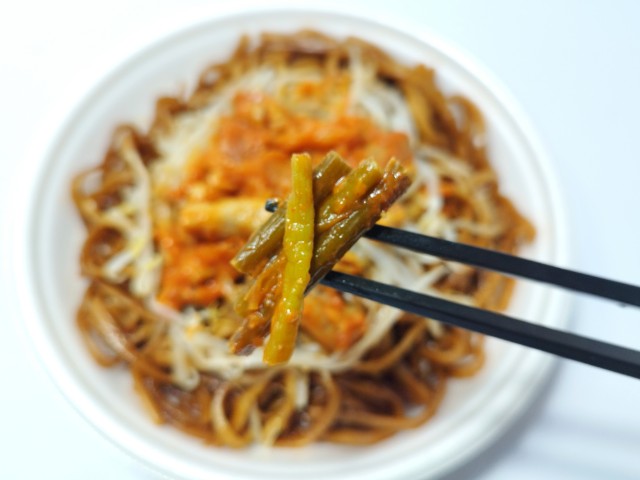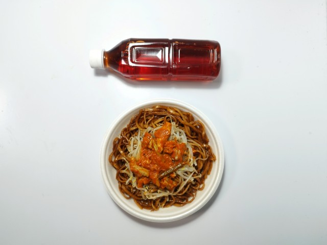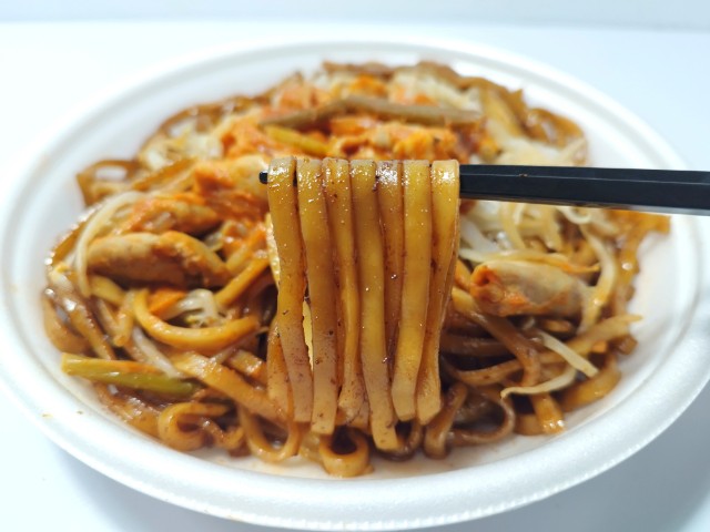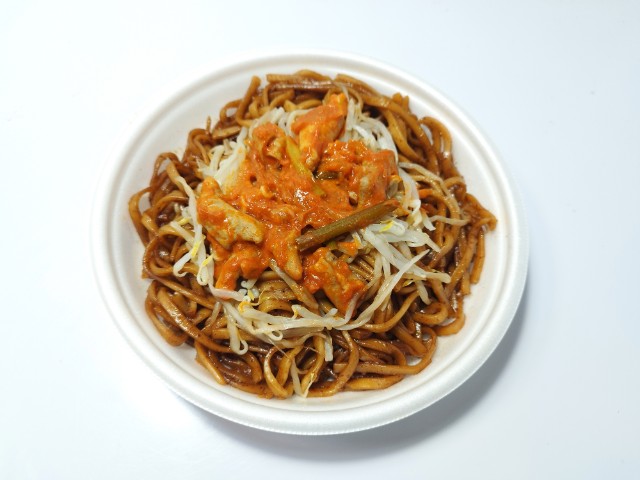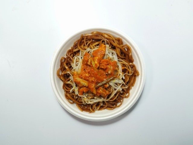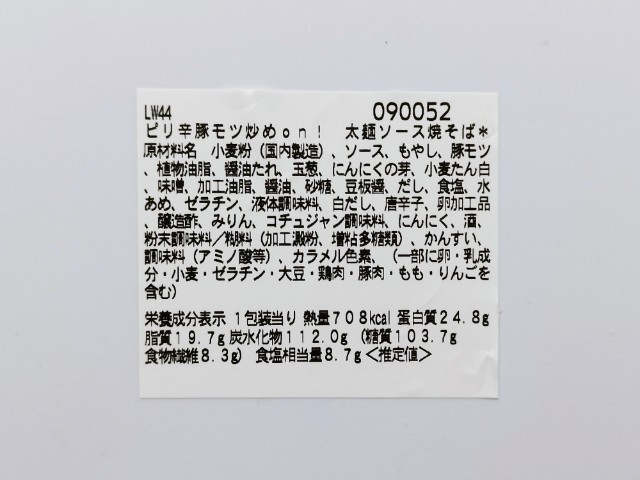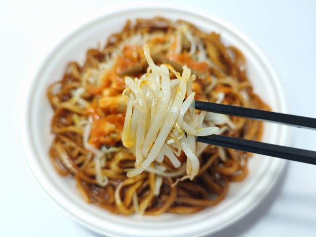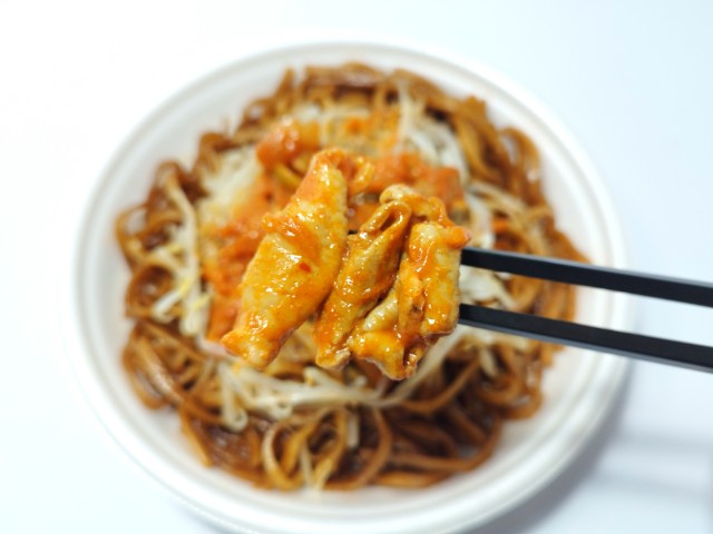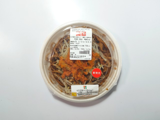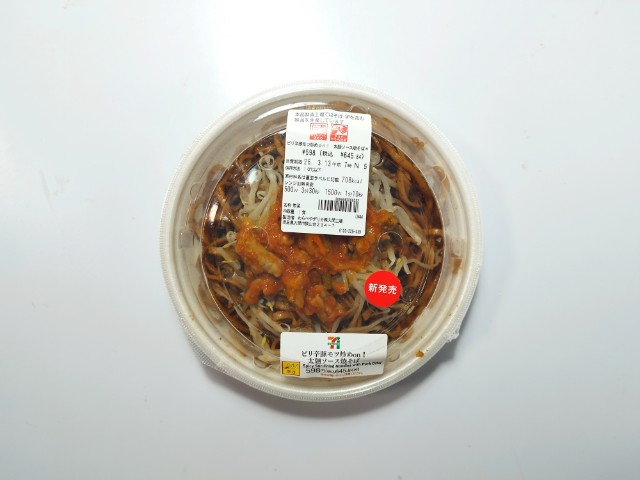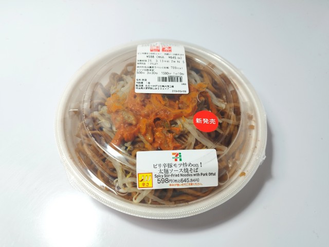 セブンイレブンの商品「ピリ辛豚モツ炒めon! 太麺ソース焼そば」を食べてみました。
