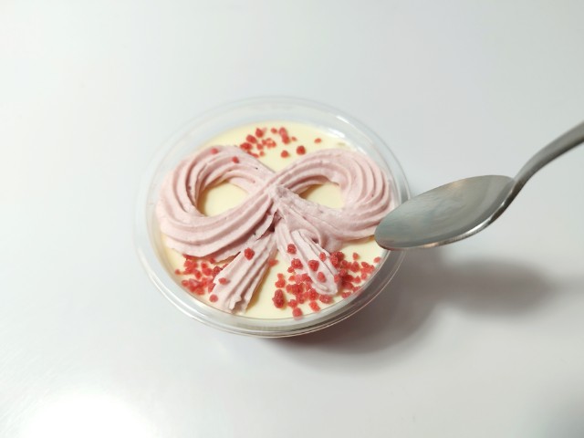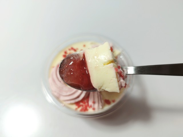 ティラミスわらび餅のいちごです。以前にティラミスわらび餅(2026年2月18日発売)がありましたが、今回はいちごになっています。セブンイレブンでは3月3日よりエスターバニーとのコラボを開催していて、今回の商品もその対象商品の一つになっています。ちなみにエスターバニーをネットで調べたところ、韓国系アメリカ人のイラストレーター、エスター・キム(Esther Kim)氏がデザインした、POPでガーリーなテイストが特徴のウサギのキャラクターだそうで、10代〜20代の若い女性(Z世代)を中心にトレンドになっているそうです。そんなティラミスわらび餅ですが、上からいちごチップキャンディ、いちごあんクリーム、ティラミスムース、いちごソース、いちごわらび餅になっていて、いちごチップキャンディはカリカリとした食感、いちごあんクリームはいちごの風味とほどよい甘味で、味や食感のアクセントになっています。ティラミスムースはなめらかな味わいとチーズの風味、いちごソースはとろりとした食感と果肉の味わい、いちごわらび餅はプルンとした食感といちごの甘味で、味と食感のバランスが良いです。内容量は一人分にちょうどよく、おやつや食後のデザートにオススメです。ぜひティラミスわらび餅のいちごを食べてみてください。