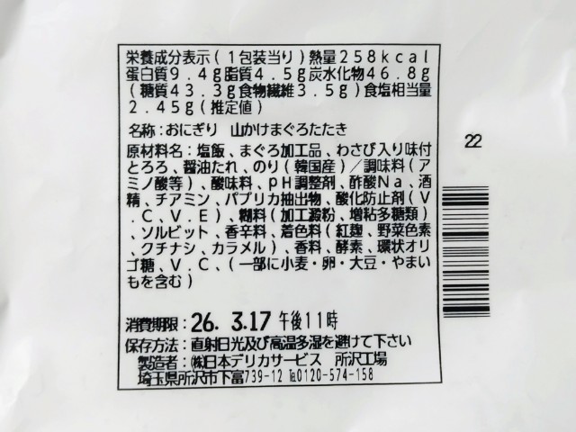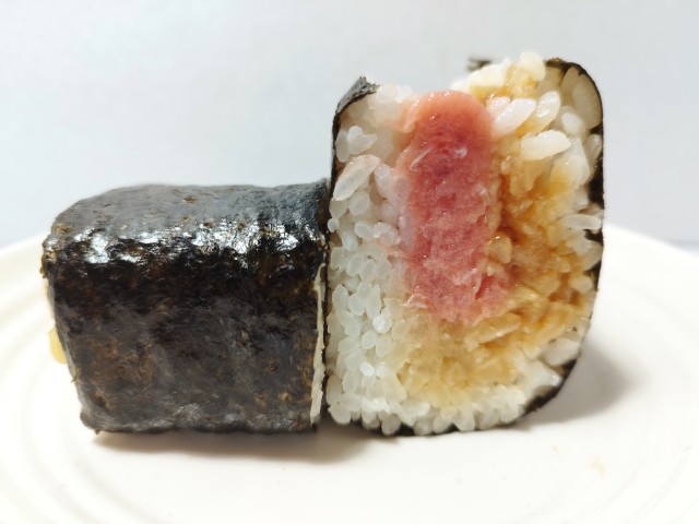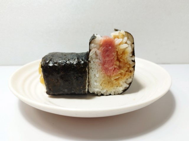 山かけまぐろたたき丼のようなおにぎりです。これまで具!おにぎりシリーズも色々と発売されていますが、今回は山かけまぐろたたき丼になっています。そんなおにぎりですが、まぐろたたきなめらかな食感まぐろの旨味があって、臭みもなく美味しいのひと言です。まぐろたたきと一緒に入ったわさび入りの味付とろろがポイントで、とろけるような食感わさびの風味が加わる事で、まぐろたたきの美味しさがより引き立ちます。普通の山かけまぐろたたき丼ではそれだけでお腹がいっぱいになってしまいますが、このおにぎりならば山かけまぐろたたき丼を味わいながらもカップ麺サラダなども追加出来ます。ぜひまるで山かけまぐろたたき丼具!おにぎりを食べてみてください。