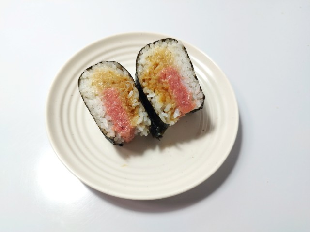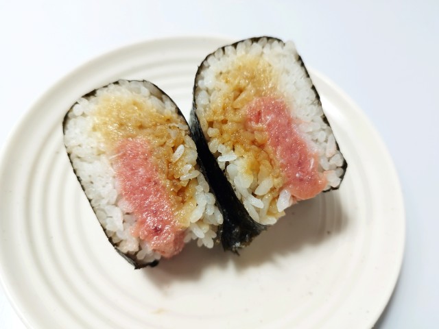 まるで山かけまぐろたたき丼具!おにぎりを美味しくいただきますっ!!