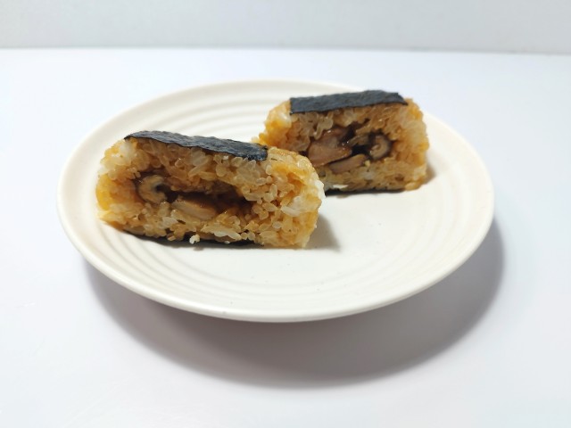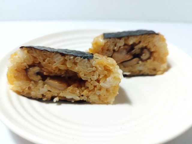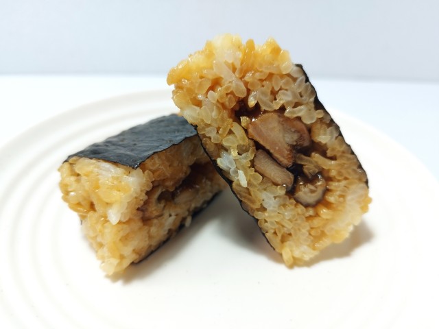 炭火焼鳥を使ったおむすびです。以前に直巻おむすび 炭火炙り焼鳥(2025年7月15日発売)がありましたが、価格以外は見た目や形など色々と違っているので、今回は別物として紹介しています。そんなおむすびですが、焼鳥は鶏の旨味とほどよい弾力、甘辛いタレの味わいがあって、ご飯が進む一品になっています。ポイントはタレに入っている七味唐辛子で、ピリッとした辛味が味のアクセントになっています。ご飯はだしの旨味と醤油の風味を楽しめるまだら飯で、焼鳥とのバランスも良いです。大きさは普通のおむすびサイズで、小腹が空いた時や主食にあと一品追加したい時にピッタリです。ぜひ炭火焼鳥のおむすびを食べてみてください。