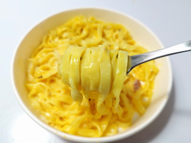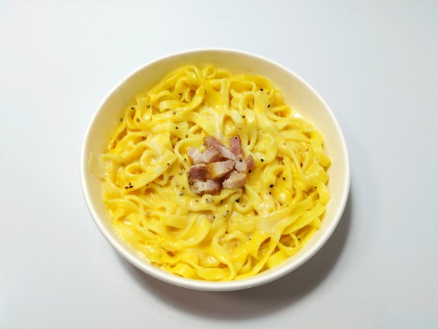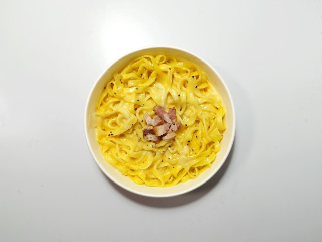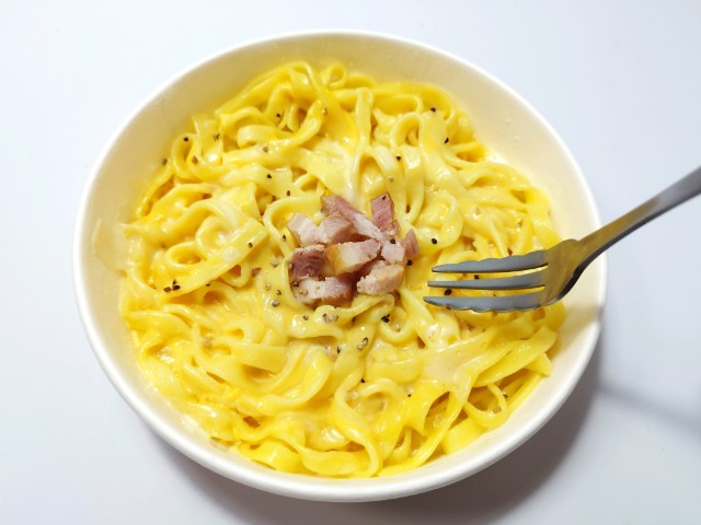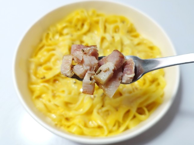 生パスタのカルボナーラです。卵黄のコクの言葉に惹かれて買ってみた商品で、個人的には楽しみにしていた新商品の一つでもあります。そんなカルボナーラですが、カルボナーラソースは卵黄のコクとチーズの風味、クリームのなめらかな味わいがあって、ハマってしまう美味しさです。パスタは生パスタのフェットチーネで、もちもちとした食感と小麦の風味で、食べ応えがあります。トッピングにはベーコンやブラックペッパーなどがのっていて、それぞれ味や食感のアクセントになっています。特にブラックペッパーのピリッとした辛味が味のアクセントになっていて、最後のひと口まで美味しく食べられます。パスタのもちもち食感とソースの濃厚さで、食べた後の満足度も高いと思います。内容量は1食分にちょうどよく、お腹も満たされます。ぜひ卵黄のコク濃厚カルボナーラを食べてみてください。