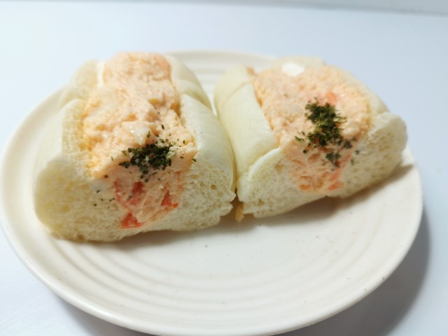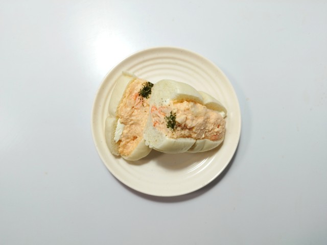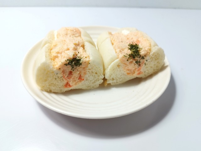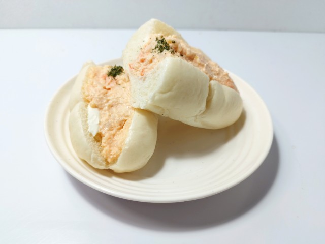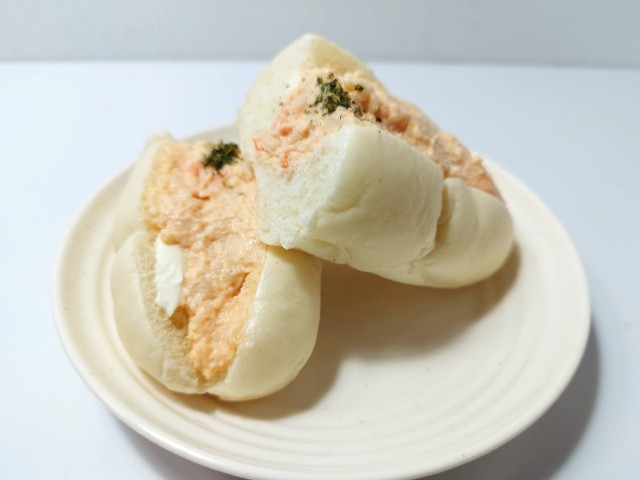 明太ポテトサラダとクリームチーズを挟んだロールパンです。明太ポテトサラダとクリームチーズの組み合わせに惹かれて買ってみました。そんな明太ポテトサラダ&クリームチーズですが、生地はもっちりとした食感と歯切れの良さで、安定の美味しさです。明太ポテトサラダは明太子の旨味とじゃがいもの味わい、マヨネーズのやさしい酸味で、美味しいのひと言です。クリームチーズはチーズの風味となめらかな食感で、明太ポテトサラダの美味しさがさらに引き立っています。明太ポテトサラダの味わいからクリームチーズの風味がふわっと残るといった感じで、最後のひと口まで美味しく食べられます。大きさは普通の惣菜パンくらいで、朝食や小腹が空いた時にピッタリです。ぜひ明太ポテトサラダ&クリームチーズを食べてみてください。