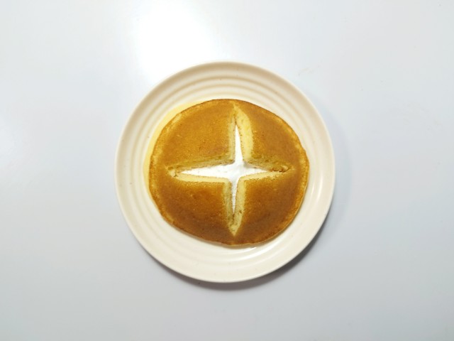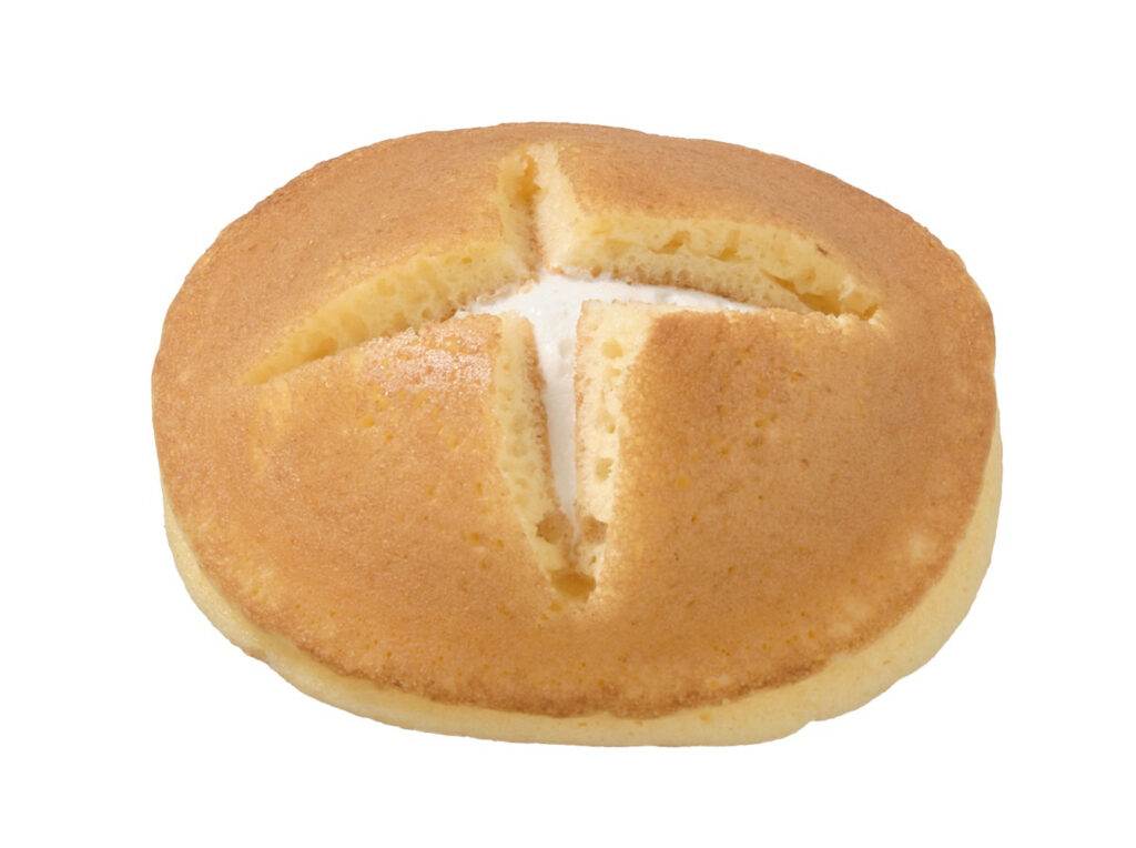 北海道牛乳入りのホイップクリームをたっぷりとパンケーキにはさみました。中のホイップクリームが見えるように生地を十字にカットしております。