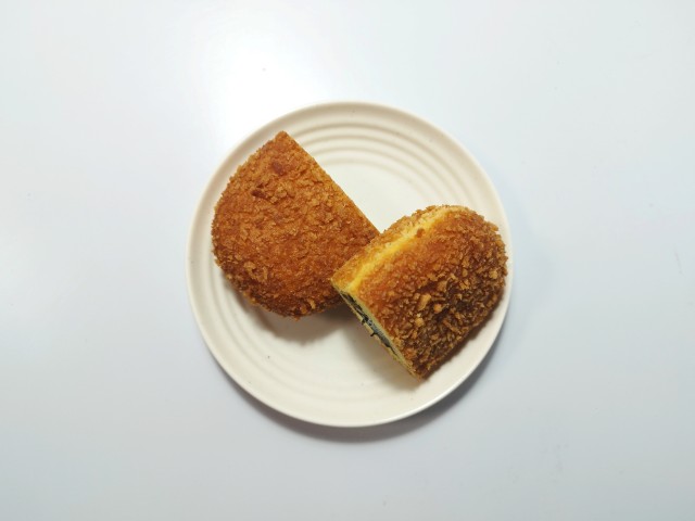 チーズクリームが入ったブラックカレーパンです。ブラックカレーだけでもかなり興味をそそられますが、そこにチーズクリームが入っているとのことで、さっそく買ってみました。そんなブラックカレーパンですが、外の生地サクッとした食感中の生地もちっとした食感で、安定の美味しさです。中の黒いカレーフィリングスパイスの風味カレーの味わいで、生地とのバランスも良いです。チーズクリームが入っていることで、辛味はかなり抑えられているので、辛いのがちょっと苦手な方にも食べやすいと思います。大きさは普通の惣菜パンくらいで、おやつ小腹が空いた時にピッタリです。ぜひブラックカレーパンを食べてみてください。