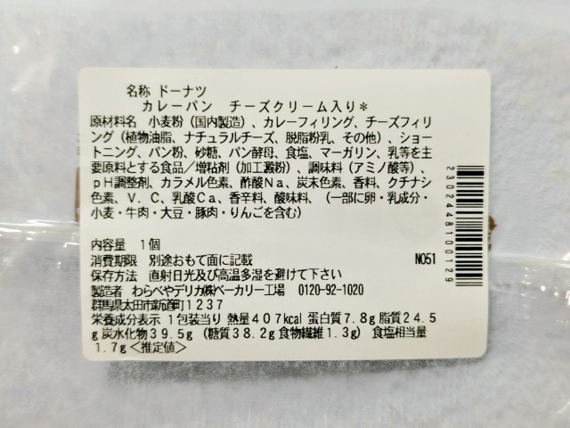 熱量:407kcal、たんぱく質:7.8g、脂質:24.5g、炭水化物:39.5g(糖質:38.2g、食物繊維:1.3g)、食塩相当量:1.7g