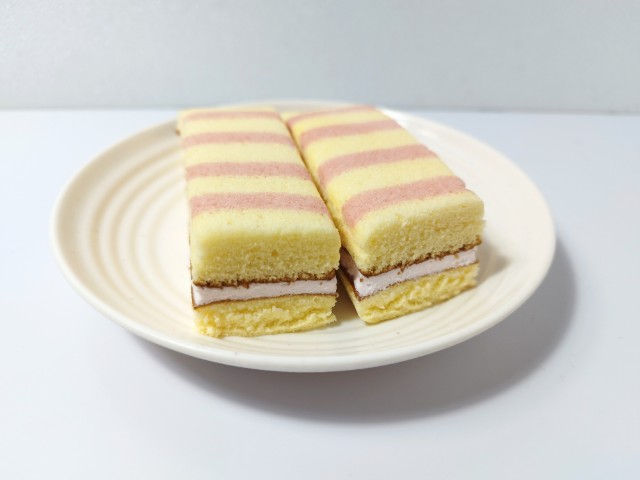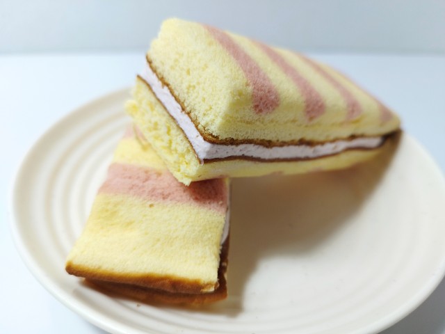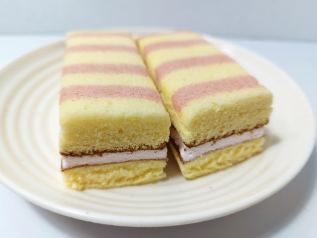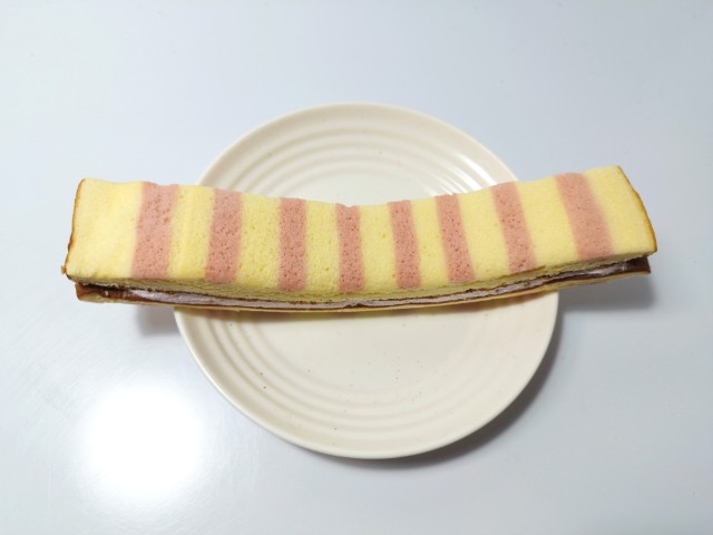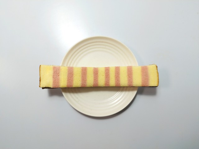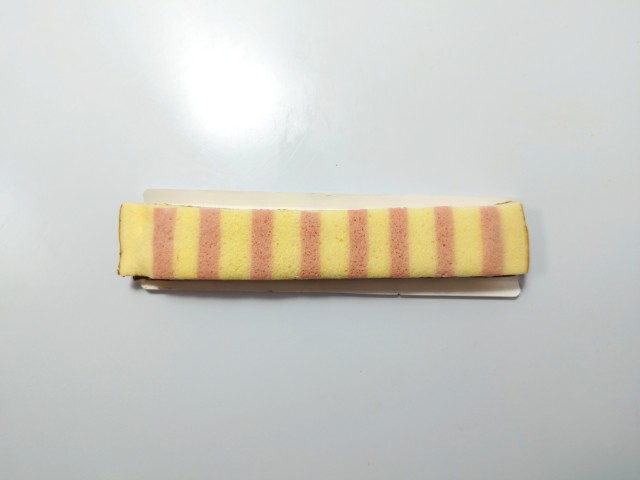 ストライプ模様をつけたスポンジ生地で苺ジャム入りクリームをサンドした、長いスティックケーキです。