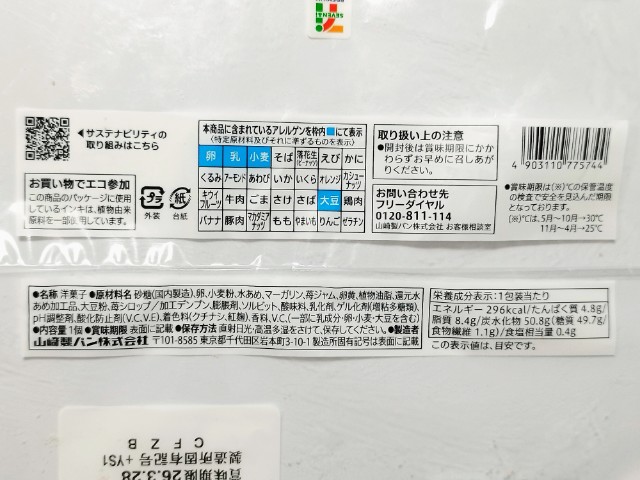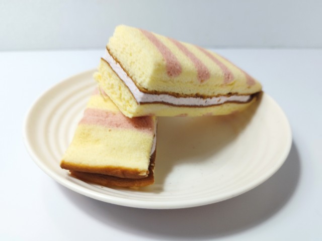 苺ジャム入りクリームを挟んだスティックケーキです。ベーカリーコーナーあるスティックケーキで、その見た目に惹かれて買ってみました。そんなロングスティックケーキですが、スポンジ生地はしっとりとした食感とくちどけの良さ、やさしい甘みがあって、間違いのない美味しさです。ちなみに生地の色による味の違いはありません。生地の間には苺ジャム入りクリームが挟まっていて、いちごの甘酸っぱさとクリームのなめらかな味わいで、生地とのバランスも良いです。普通のスティックパンだと袋から出さずにワンハンドで食べることもできますが、この商品は土台が付いている所からもわかるようにかなり柔らかいスポンジ生地なので、一旦出して切り分けて食べるのがベストだと思います。大きさは普通の菓子パンサイズくらいで、おやつや小腹が空いた時にピッタリです。ぜひロングスティックケーキを食べてみてください。