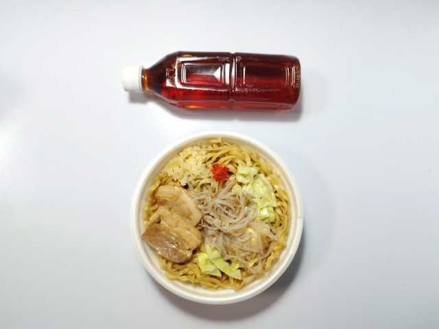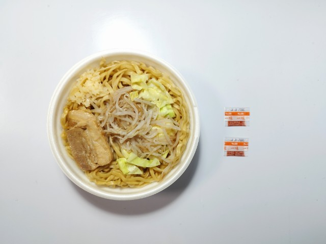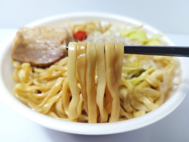 増量されたラーメン荘歴史を刻め監修豚ラーメンです。ファミリーマートでは3月24日から今年で6年目を迎えたうまくて、ドでかい!お値段そのまま「なぜか45%増量作戦」キャンペーンを開催していて、今回の商品もその対象商品の一つになっています。個人的にはファミリーマートの増量作戦というと例年7月か8月あたり4週にかけて開催していたので、少々面を食らってしまいましたが、今回は2週という短い期間なので、もしかしたら7月8月メインの増量キャンペーンがやってくるのかもしれません。話がズレましたが、内容としては豚ラーメンが今だけなぜか45%増量になっているらしいです。そんな豚ラーメンですが、スープ豚の旨味醤油の風味にんにくの味わいがあって、ハマってしまう美味しさです。ほどよい弾力小麦の風味があって、食べ応え抜群です。具材にはチャーシューもやし刻みにんにくキャベツなどがのっていて、それぞれの味や食感を楽しめます。また、にんにくがしっかりと利いているので、食後に人と会う場合は注意が必要だと思います。内容量は見ての通りの大盛なので、ガッツリ食べたい方にはちょうど良いです。ぜひ豚ラーメンを食べてみてください。