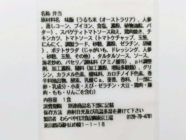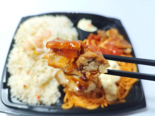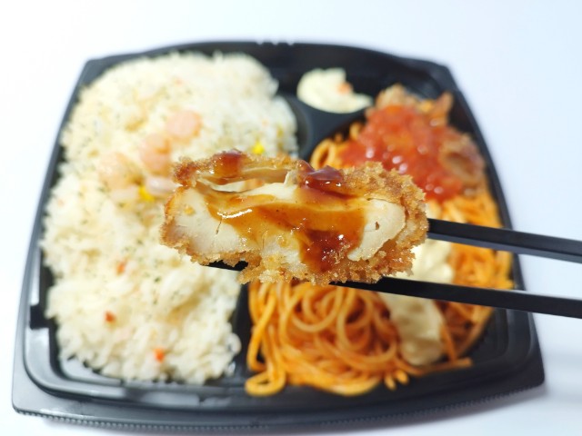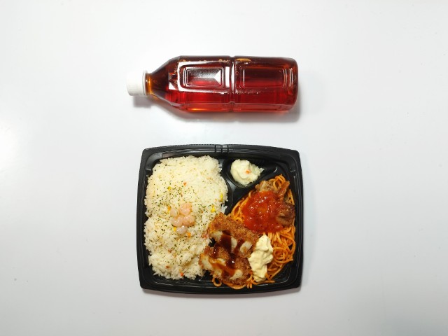 海老がのったバターピラフチキンステーキチキンカツ2種類のチキンナポリタンがのったお弁当です。かなり情報量の多いお弁当ですが、そのボリュームある見た目に惹かれて買ってみました。そんな海老バターピラフ&Wチキンナポリタン弁当ですが、バターピラフパラパラとした食感ブイヨンの旨味バターの風味があって、これだけでも美味しく食べ進められます。また、トッピングの小海老が味や食感のアクセントになっているのもポイントです。チキンカツ鶏肉のジューシーな味わいソースの酸味チキンステーキほどよい弾力の肉質ガーリックトマトソースの旨味で、ご飯が進む一品になっています。ナポリタントマトソースの味わいもちっとした食感で、安定の美味しさです。他にもポテトサラダタルタルソースがのっていたりと最後のひと口まで飽きることなく食べられます。1食あたり960kcalと見た目通りのハイカロリー弁当で、ガッツリ食べたい方にはちょうどよいお弁当だと思います。ぜひ海老バターピラフ&Wチキンナポリタン弁当を食べてみてください。