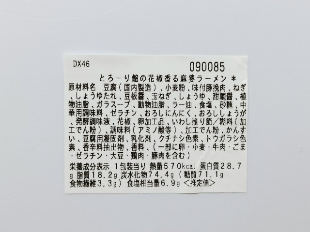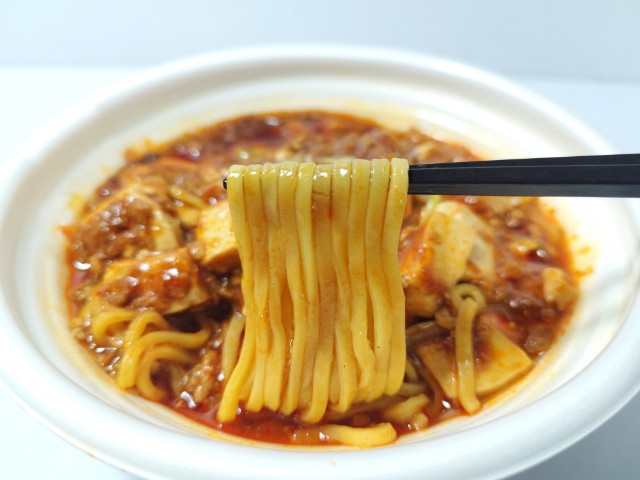 麻婆豆腐あんがのったラーメンです。見つけた瞬間に手に取ってしまった商品で、個人的には楽しみにしていた新商品の一つでもあります。そんな麻婆ラーメンですが、とろみのあるスープはほどよい辛味と花椒の痺れ、ガラの旨味があって、ハマってしまう美味しさです。平打ちの麺はつるりとした食感とのどごしの良さで、麻婆豆腐あんとの絡みも良いです。具材には麻婆豆腐や豚ひき肉、玉ねぎなどがのっていて、味や食感のアクセントになっています。見た目ほど辛味はなくて、食べやすいですが、ひと口食べるごとに花椒の風味があって、段々と舌がマヒするような感覚になります。ただ、個人的には麻婆豆腐は辛味よりも痺れを楽しみたいので、このラーメンはかなりポイントが高いです。内容量は1食分にちょうどよく、お腹も満たされます。ぜひとろーり餡の花椒香る麻婆ラーメンを食べてみてください。