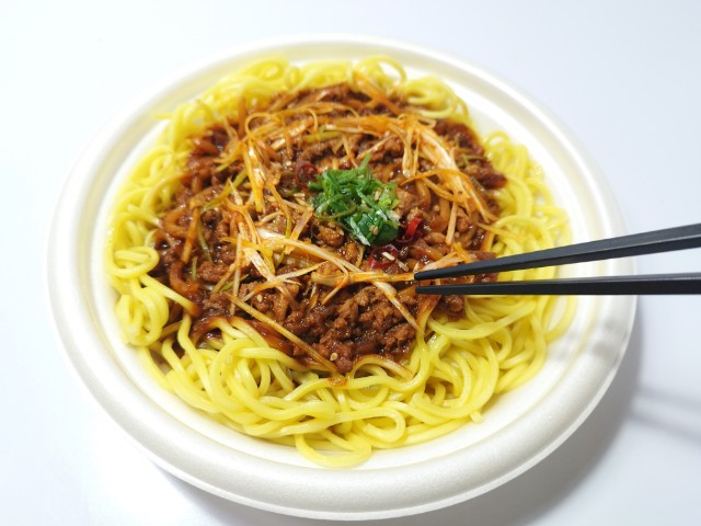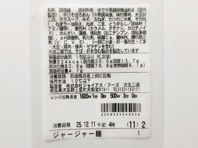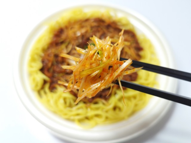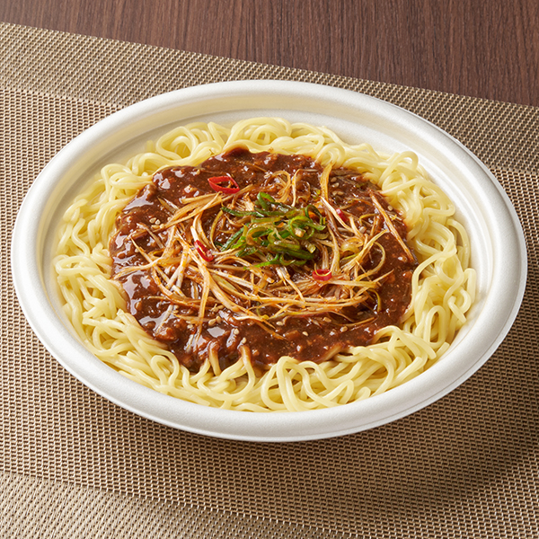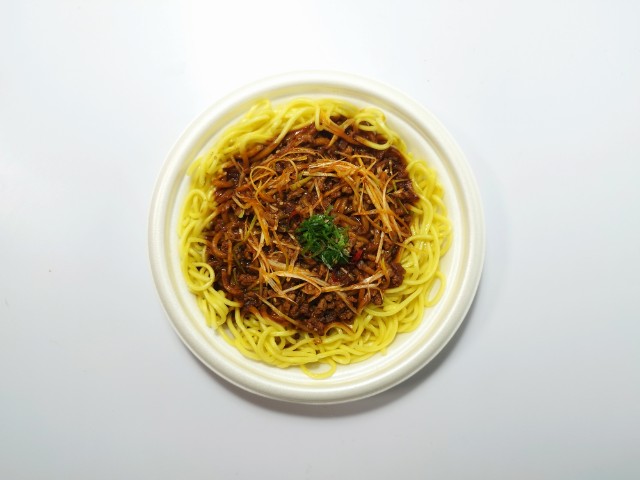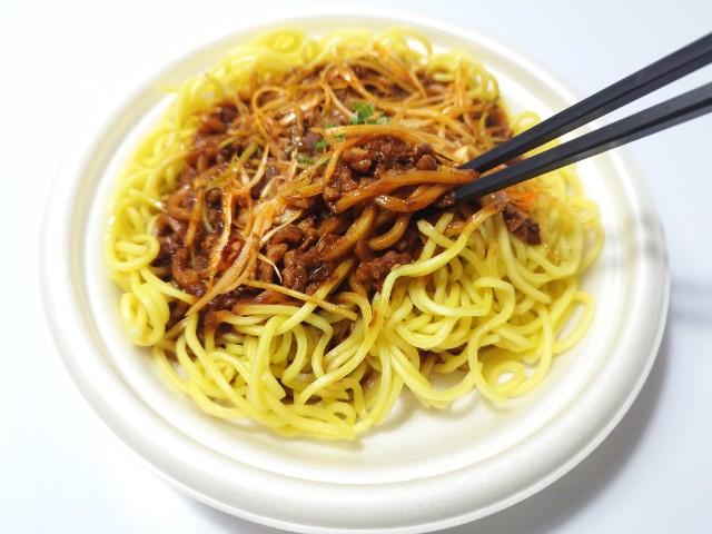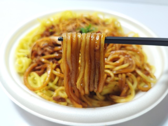 中華麺とジャージャーあんを混ぜて食べるジャージャー麺です。以前の購入が2025年8月26日発売だったので、約4ヶ月近く経っていますが、価格は変わっていません。そんなジャージャー麺ですが、ジャージャーあんは甜麺醤の味わいとピリッとした辛味、たけのこの食感があって、クセになる美味しさです。中華麺はツルツルとした食感と小麦の風味で、ジャージャーあんとの相性抜群です。トッピングには白髪ねぎラー油和えや青ねぎ、輪切り唐辛子などが使われていて、それぞれの味や食感を楽しめます。内容量は1食分にちょうどよく、お腹も満たされます。ぜひジャージャー麺を食べてみて下さい。