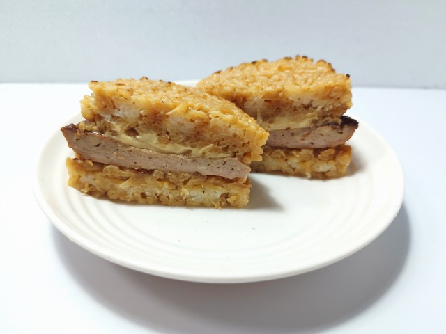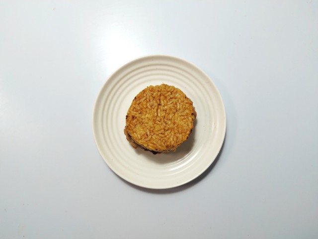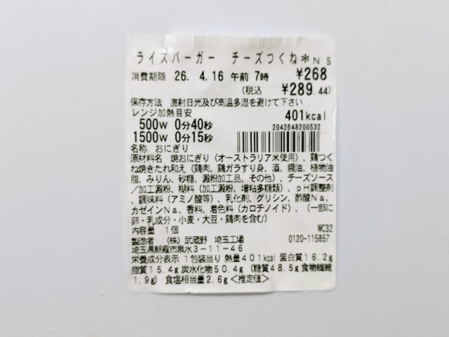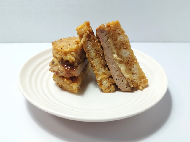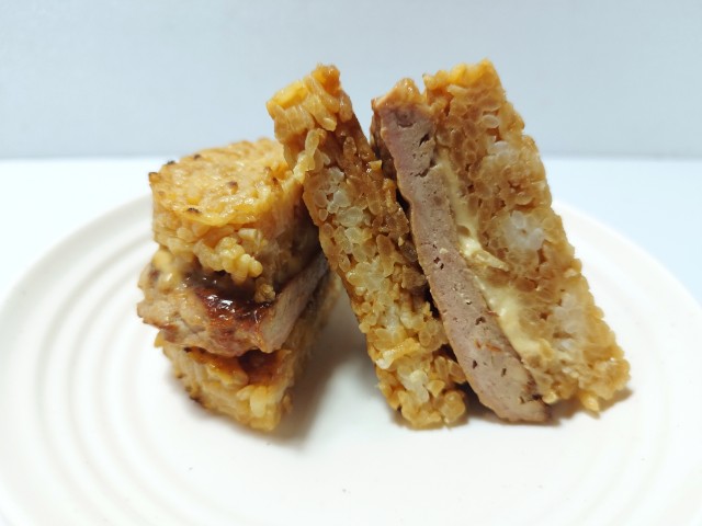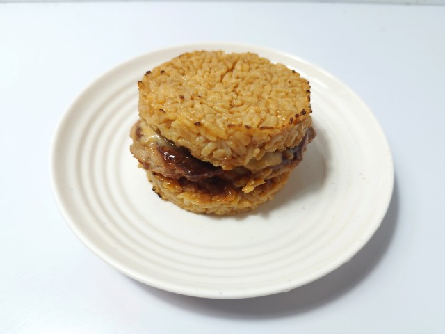 鶏つくねとチーズソースを使ったライスバーガーです。つくねとチーズソースの組み合わせに惹かれて買ってみました。そんなライスバーガーですが、バンズの代わりでもあるご飯は醤油たれで味付けされた焼おにぎりになっていて、醤油の風味と香ばしい味わいで安定の美味しさです。鶏つくねはふっくらとした食感と甘辛いたれの味わいで、ご飯との相性抜群です。ポイントは一緒に挟まっているチーズソースで、なめらかな食感とチーズの濃厚な味わいが鶏つくねの美味しさをさらに引き立てています。そのままでも美味しく食べられますが、温めることで醤油の風味や鶏つくねの旨味がアップするので、余裕があれば温めて食べることをオススメします。大きさは普通のおむすびサイズで、小腹が空いた時や主食にあと一品追加したい時にピッタリです。ぜひチーズつくねのライスバーガーを食べてみてください。