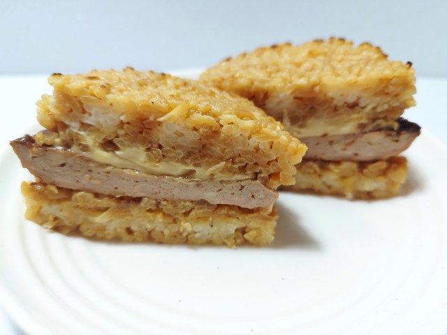 ハンバーガーのバンズ(パン)の代わりに、ご飯を使ったライスバーガーです。肉感のあるつくねに、濃厚なチーズソースを組合せました。