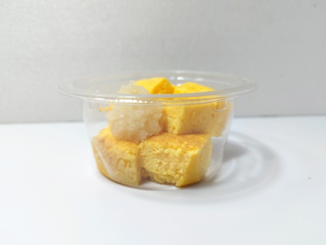 大根おろしを添えた玉子焼きです。大根おろしが入った玉子焼きで、その見た目に惹かれて買ってみました。そんな大根おろしを添えた玉子焼きですが、玉子焼きはだしの旨味とたまごの甘みがあって、間違いのない美味しさです。この玉子焼きだけでも十分美味しいですが、別添の大根おろしと一緒に食べることで、大根の風味とさっぱりとした味わいが加わって、より美味しく食べ進められます。カップデリなので内容量は多くはありませんが、おつまみやおかずをもう一品追加したい時にピッタリの商品です。ぜひ大根おろしを添えた玉子焼きを食べてみてください。