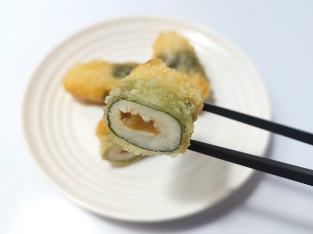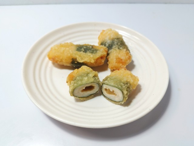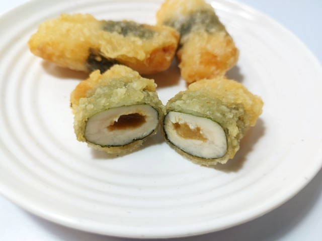 鶏ささみで梅と大葉を巻いて、薄衣で揚げました!