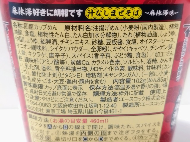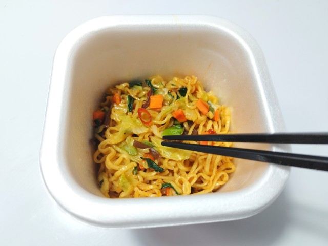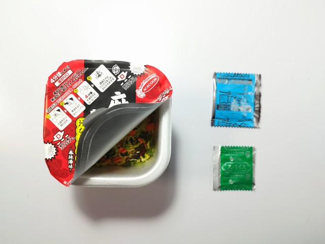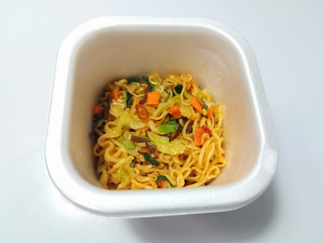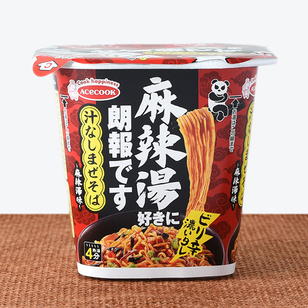 麻辣湯味の汁なしまぜそばです。ファミリーマート限定のカップ麺で、熱湯を入れて4分後に中のお湯を捨てて、調味たれとスパイスを加えてよくかき混ぜたら完成となります。そんな汁なしまぜそばですが、醤の旨味と唐辛子のピリッとした辛味、花椒の痺れがあって、クセになってしまう美味しさです。麺はもちっとした食感と歯切れの良さがあって、箸がどんどんと進みます。具材にはキャベツやチンゲン菜、人参、きくらげなどが入っていて、それぞれの味や食感を楽しめます。オイスターソースや紹興酒を使うことで、麻辣湯の味わいに近づけたカップ麺といった感じで、麻辣湯好きに朗報ですの商品名にも納得だと思います。また、食べた瞬間は痺れがメインですが、後からジワジワと辛味がやってくるといった感じで、かなりのシビ辛なので、辛いのが苦手な方は食べる時は注意した方が良いと思います。内容量は普通のカップ麺サイズで、小腹が空いた時やおにぎりやパンと合わせて1食分にするのにもオススメです。ぜひ麻辣湯味の汁なしまぜそばを食べてみてください。