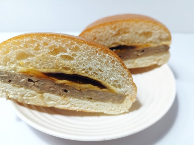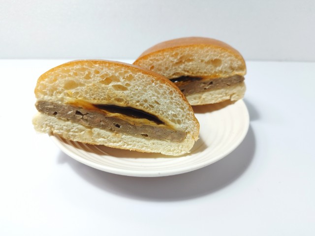 ハンバーグを挟んだ惣菜パンです。ハンバーグにてりやきソースとマヨネーズの組み合わせの時点で、美味しいイメージしかなく、思わず手に取ってしまいました。そんなどかっと満足パンですが、バンズはふんわりとした食感と歯切れの良さで、安定の美味しさです。ハンバーグは肉の旨味と柔らかい肉質で、バンズとのバランスも良いです。ポイントはやはりてりやきソースとマヨネーズで、てりやきソースの甘辛い味わいとマヨネーズのほのかな酸味が、ハンバーグの美味しさをさらに引き立てています。大きさは普通の惣菜パンくらいで、小腹が空いた時や主食にあと一品追加したい時にピッタリです。ぜひテリマヨハンバーグのどかっと満足パンを食べてみてください。