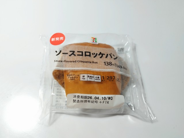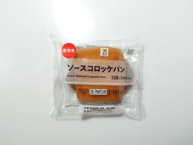 ソースコロッケパンです。セブンイレブンのコロッケパンというと、先週リニューアルされたほぼ通年販売でもあるこだわりソースのふんわりコロッケパン(2026年3月31日発売)168円(税込181.44円)がありますが、こちらは価格やサイズが少し抑えられた商品になっています。そんなソースコロッケパンですが、生地はふんわりとした食感と小麦の風味で、安定の美味しさです。コロッケはしっとりとした食感とソースの旨味で、生地とのバランスも良いです。普通の惣菜パンサイズでもちょっと大きすぎると思っている方や小腹を軽く満たしたいだけと思っている方にはコスパの良い商品で、普通に食べたいと思っている方でもカップ麺やサラダなどといった商品と合わせて1食分にするのに、価格が抑えられている今回の商品を選択すれば同様にコスパが良くなると思います。大きさは普通の惣菜パンよりもやや小さく、小腹が空いた時や主食にあと一品追加したい時にピッタリです。ぜひソースコロッケパンを食べてみてください。