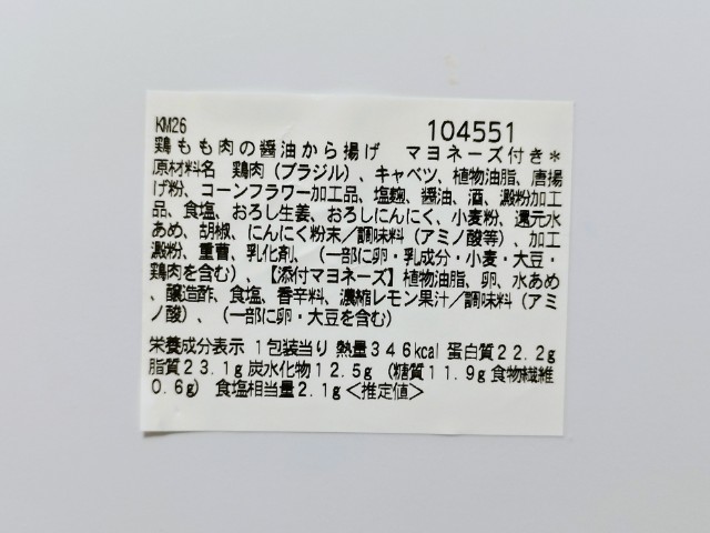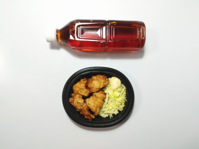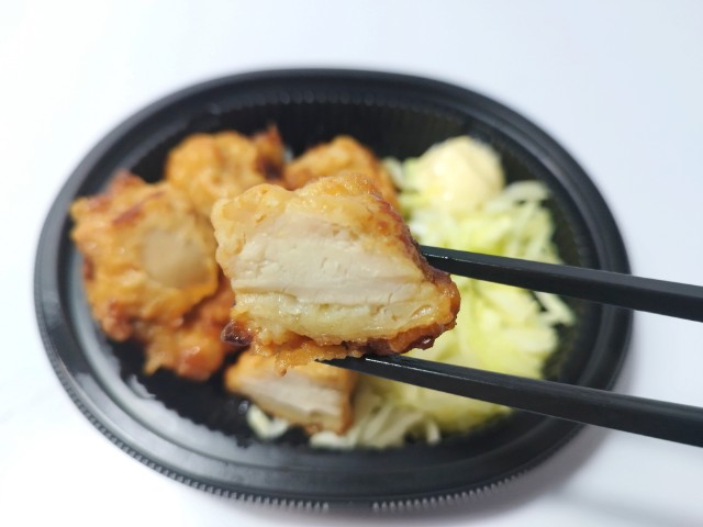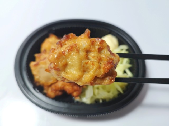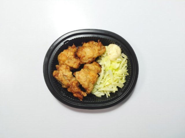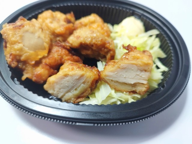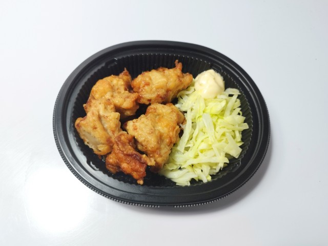 鶏もも肉の醤油から揚げです。見つけた瞬間に手に取ってしまった商品で、個人的には楽しみにしていた新商品の一つでもあります。そんな鶏から揚げですが、ジューシーな味わいと醤油の旨味、にんにくの風味があって、間違いのない美味しさです。キャベツはシャキシャキとした食感とほのかな甘みで、箸休めにもピッタリです。別添のマヨネーズはから揚げとキャベツのどちらにもよく合うので、最後のひと口まで美味しく食べられます。内容量は一人分にちょうどよく、ご飯のおかずやおつまみにオススメです。ぜひ鶏もも肉の醤油から揚げを食べてみてください。
