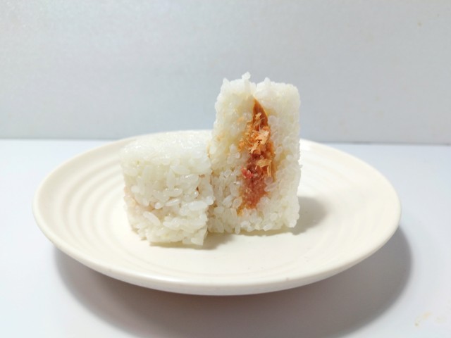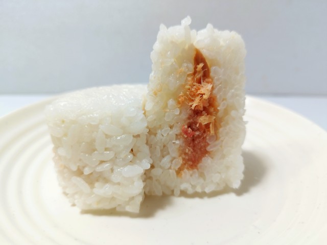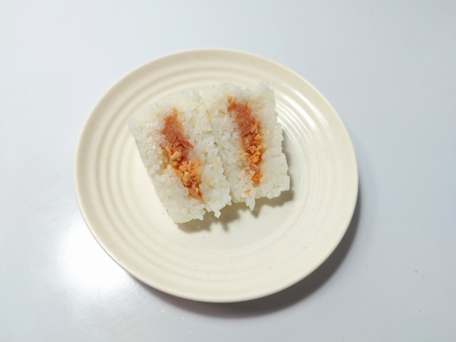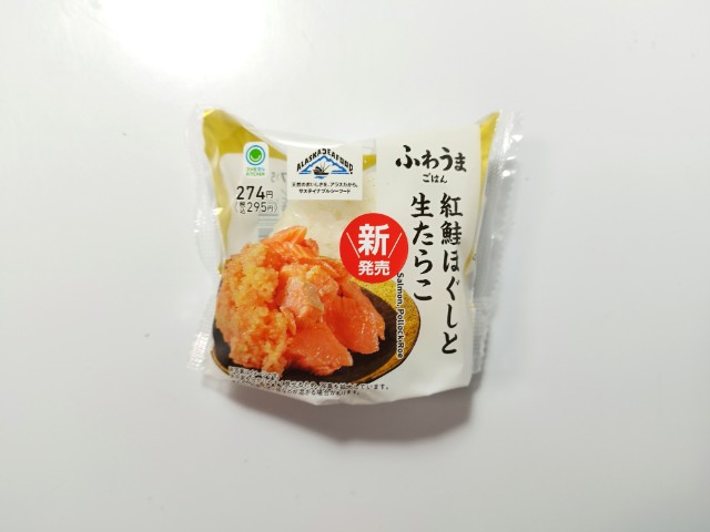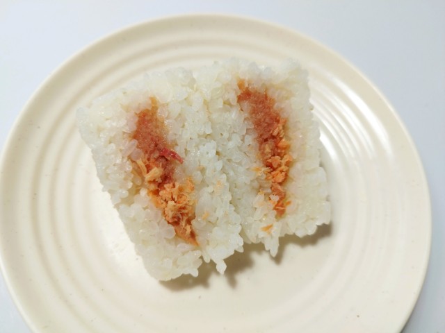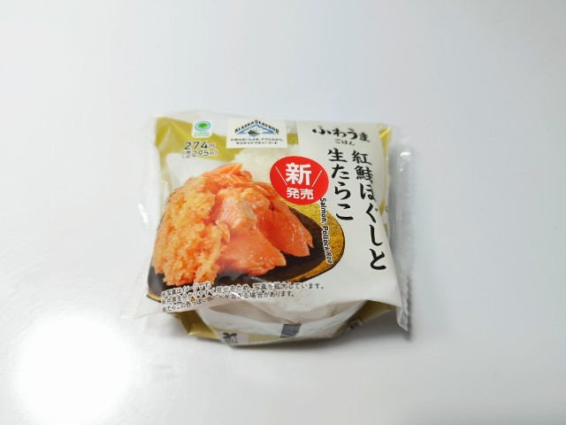 ファミリーマートの商品「紅鮭ほぐしと生たらこおむすび」を食べてみました。