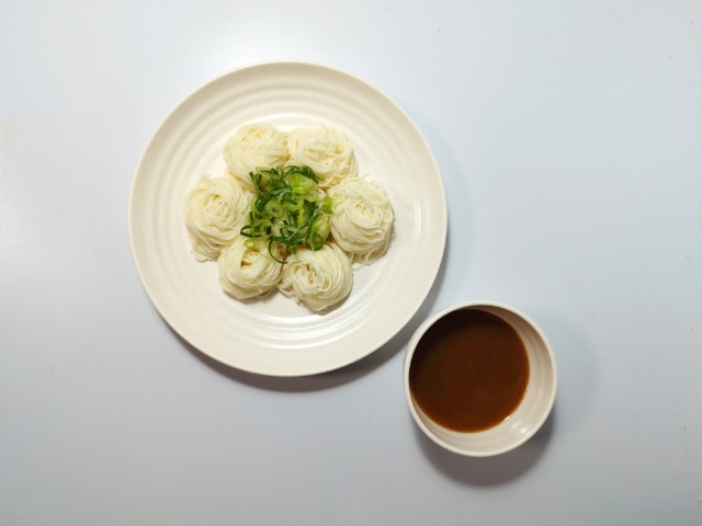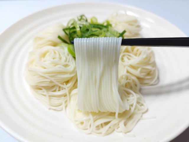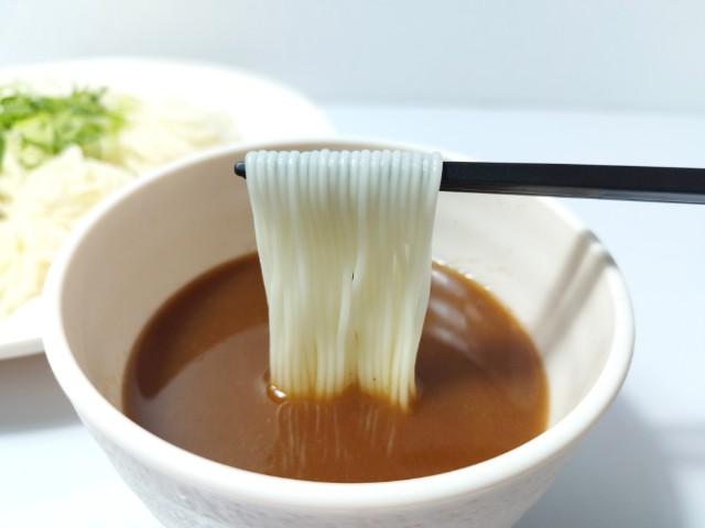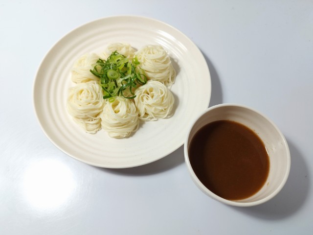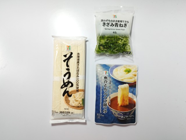 魚介とんこつのつけ麺つゆです。魚介とんこつスープではなく、魚介とんこつつけ麺つゆというのにも興味をそそられて買ってみました。そんな魚介とんこつつけ麺つゆですが、魚介の旨味と豚骨の風味、ほんのりと柚子の香りがあって、旨味しっかりながら後味はさっぱりとしています。粘度は低めでさらさらとしているので、太麺や中太麺の中華麺だとつゆとの絡みが悪く、逆に今回のそうめんや極細の中華麺にはつゆがよく絡んで、味の濃度もちょうど良いと思います。ちなみにそれぞれの価格ですが、7プレミアム そうめん 360gは198円(税込213.84円)、7プレミアム 刻み青ねぎは130円(税込140.40円)で、魚介とんこつつけ麺つゆ 178円(税込192.24円)が2人前200gで100g使用、そうめんが4人前360gで90g使用、青ねぎが40gで4g使用しているので、1食あたり約164円となっています。もちろん、もっと安い食材や良い材料をスーパーや専門店などで見つければあると思いますが、あくまでセブンイレブンの食材のみで作っているので、見た目や内容はご理解いただけると助かります。ちなみに今回は青ねぎのみでしたが、パッケージの裏面にも書かれているようにゆで卵をトッピングしても美味しいと思います。ぜひ魚介とんこつつけ麺つゆを食べてみてください。