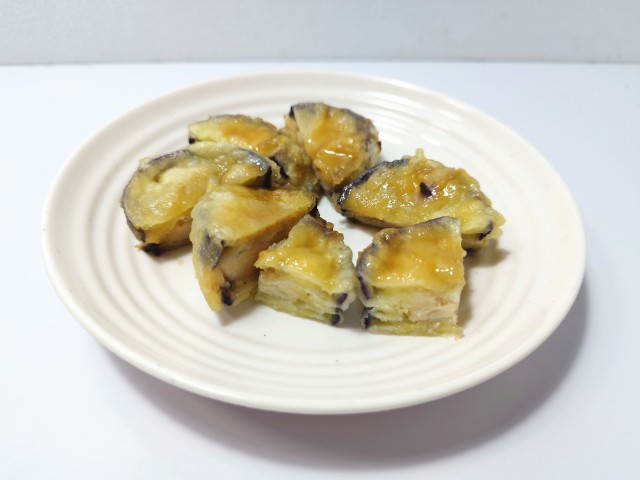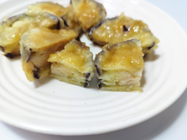柔らかい茄子の間にはひき肉がしっかりと挟まっています。