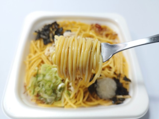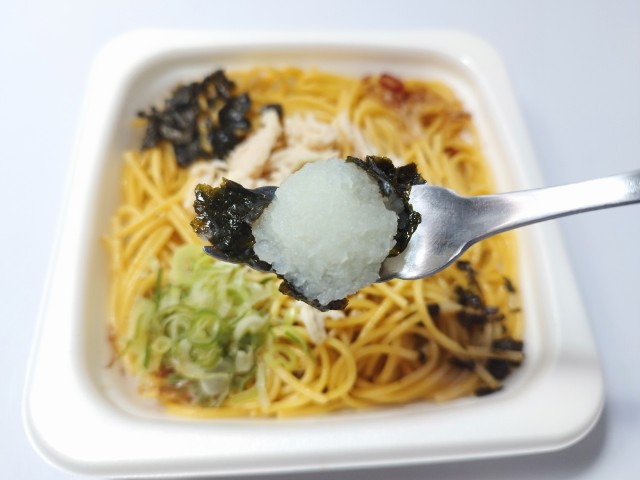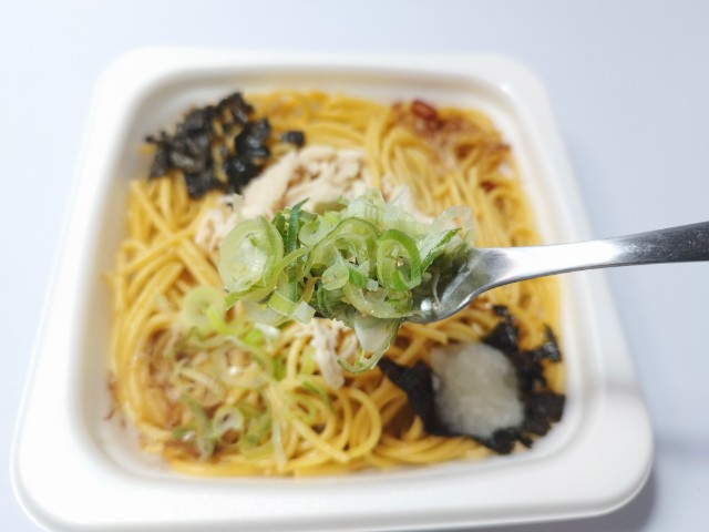 ゆず胡椒ぽん酢を使ったパスタです。以前に冷たいパスタ 冷たいパスタ 蒸し鶏のゆず胡椒ぽん酢(2025年3月4日発売)がありましたが、今回は温かいパスタになっています。そんなパスタですが、和風ソースは醤油の旨味とぽん酢の酸味、ゆず胡椒の風味で、安定の美味しさです。細パスタはほどよい硬さとのどごしの良さがあって、和風ソースとのバランスも良いです。トッピングにはゆず胡椒や蒸し鶏、かつおぶし、ねぎ、海苔、大根おろしなどがのっていて、味や食感のアクセントになっています。さっぱりと食べられる和風パスタといった感じで、トッピングをかけ合わせながら食べ進めるのがオススメです。内容量は1食分にちょうどよく、お腹も満たされます。ぜひ蒸し鶏のゆず胡椒ぽん酢パスタを食べてみてください。