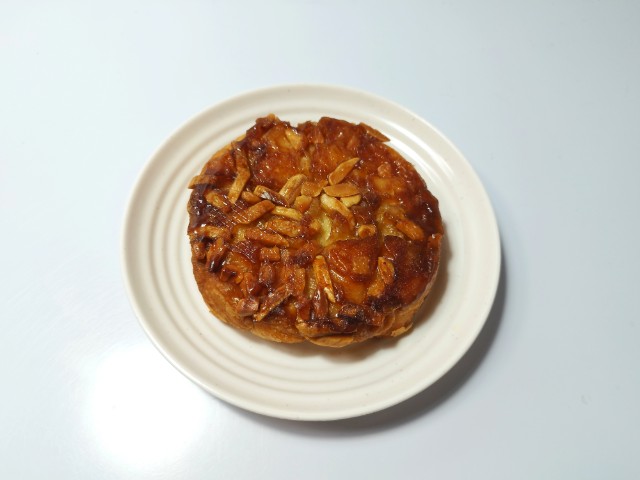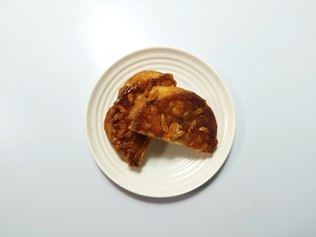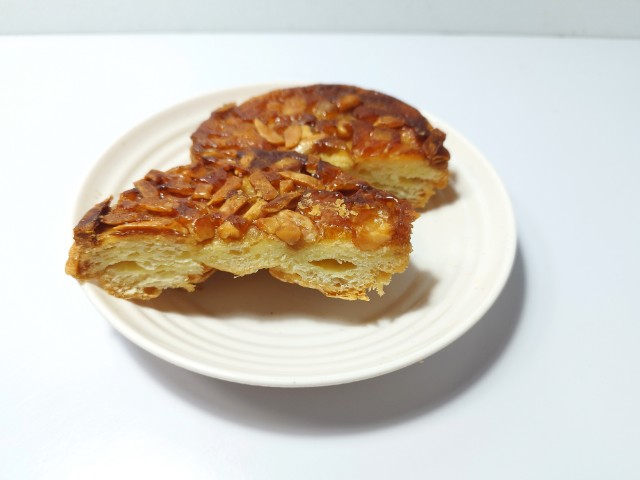 バター香るクロッカンです。商品名に惹かれて買ってみました。そんなバター香るクロッカンですが、飴掛けされた生地はしっとりとした食感とほどよい甘み、香ばしい味わいがあって、美味しいのひと言です。トッピングの飴掛けはガリガリとした食感としっかりとした甘み、アーモンドとマカダミアナッツは食感のアクセントになっていて、最後のひと口まで美味しく食べられます。大きさは普通の菓子パンサイズで、おやつや小腹が空いた時にピッタリです。バター香るクロッカンをたべみてください。