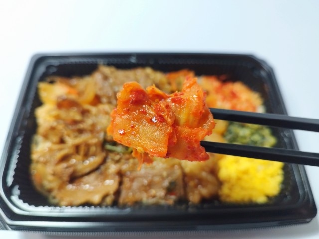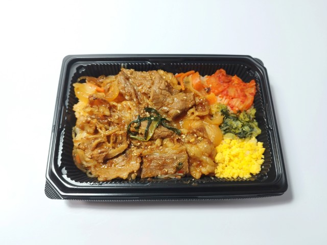 コチュジャンだれで味付けをした御飯の上に、炭火で焼き上げたプルコギやチャプチェ,キムチなどを盛り付けたお弁当です。