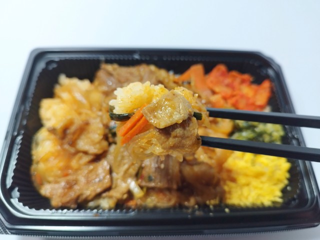 プルコギチャプチェなどがのったお弁当です。以前に甘辛タレのプルコギ丼(2025年2月9日発売)がありましたが、今回はお弁当になっています。そんな炭火焼きプルコギ弁当ですが、プルコギの牛肉牛の旨味ジューシーな肉質甘辛いタレの味わいで、ご飯が進む一品になっています。また牛肉と一緒に春雨人参玉ねぎなども入っていて、春雨の食感人参の味わい玉ねぎの甘みを楽しむことができます。コチュジャンだれで味付けされたご飯コチュジャンの旨味があって、プルコギチャプチェと相性抜群です。他にもキムチ小松菜玉子そぼろがトッピングされているので、最後のひと口まで飽きることなく食べられます。内容量は1食分にちょうどよく、お腹も満たされます。ぜひ炭火焼きプルコギ弁当を食べてみてください。