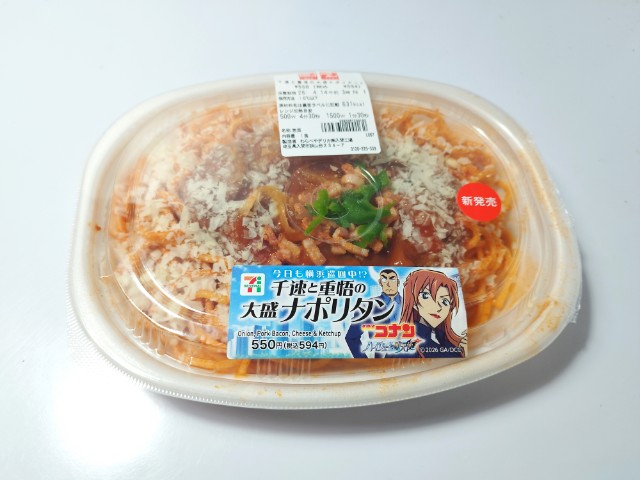 大盛のナポリタンです。セブンイレブンでは4月10日より劇場版『名探偵コナン ハイウェイの堕天使』(4月10日公開)とのコラボを開催していて、今回の商品もその対象商品の一つになっています。そんな千速と重悟の大盛ナポリタンですが、ソースはケチャップの旨味とトマトの酸味、濃厚な味わいがあって、ハマってしまう美味しさです。やや太めのパスタはもちっとした食感と小麦の風味で、食べ応え抜群です。具材にはベーコンや玉ねぎ、ピーマンなど、ナポリタンといえばの定番食材が入っていて、味や食感のアクセントになっています。その中でもマッシュルームはたっぷりと使われていて、食べ応えもしっかりとあります。今回はそのまま食べましたが、追い粉チーズやタバスコを加えて、味変しながら食べても美味しいと思います。内容量は大盛だけあって、ガッツリと食べたい方にはピッタリです。ぜひ千速と重悟の大盛ナポリタンを食べてみてください。