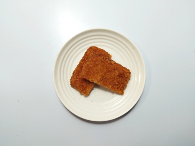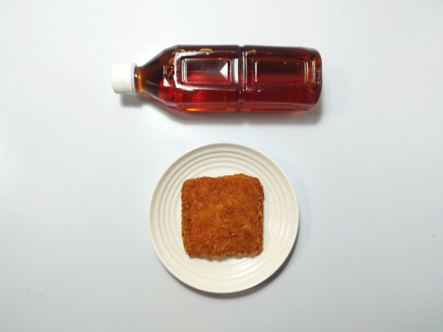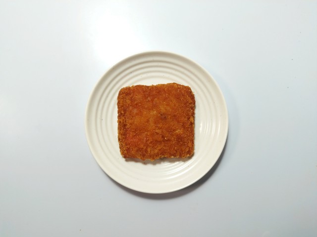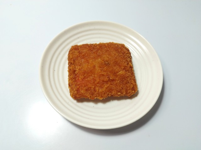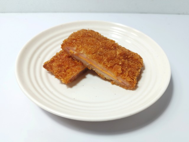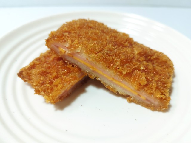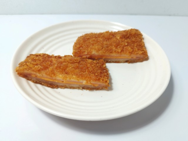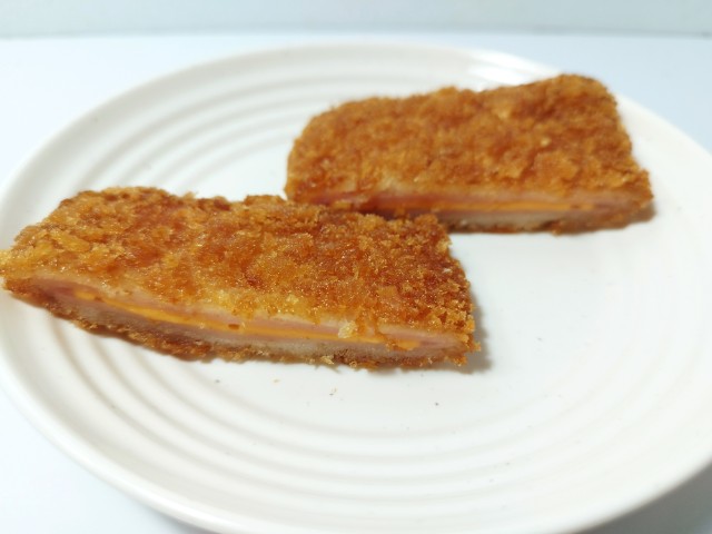 チーズを挟んだハムカツです。見つけた瞬間に買ってしまった商品で、個人的には楽しみにしていた新商品の一つでもあります。SNSでも「背徳感えぐいぶっ飛び」や「重いだけで満足感が足りない」など話題にもなっているチーズハムカツですが、衣はサクサクとした食感と香ばしさがあって、油のしつこさがありません。中のハムはしっとりとした食感と肉の旨味、チーズはなめらかな食感とチーズの濃厚な味わいで、相性抜群の組み合わせになっています。今回はソースや醤油など何もつけていませんが、そのままでもハムやチーズの塩味があるので、普通に美味しく食べられます。大きさは手のひらサイズくらいで、おつまみやご飯のおかずにオススメです。ぜひチーズハムカツを食べてみてください。