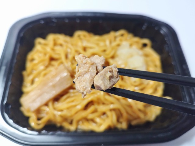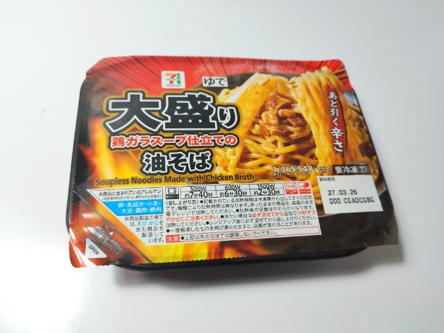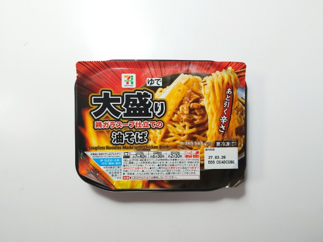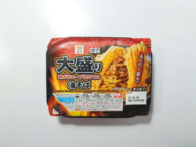 大盛りの油そばです。以前に7プレミアム 大盛り魚介豚骨まぜそば(2026年1月13日発売)がありましたが、今回は油そばになっています。そんな油そばですが、鶏ガラの旨味と醤油の風味、ラー油のの辛味があって、ハマってしまう美味しさです。麺はもちもちとした食感とのどごしの良さで、箸がどんどん進みます。具材には豚肉や玉ねぎ、メンマなどがのっていて、味や食感のアクセントになっています。食べた瞬間はそこまで感じなかった辛さも食べ進めるうちに少しずつ辛味が増していくといった感じなので、辛いのが苦手な方は食べる時は注意した方が良いと思います。見た目はシンプルですが、価格や長期保存が出来るといった部分を考えると、かなりコスパがよい商品だと思います。内容量は1食分にちょうどよく、お腹も満たされます。ぜひ大盛り油そばを食べてみてください。