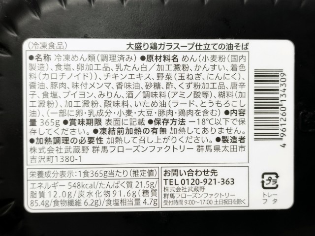 熱量:548kcal、たんぱく質:21.5g、脂質:12.0g、炭水化物:91.6g(糖質:85.4g、食物繊維:6.2g)、食塩相当量:4.7g