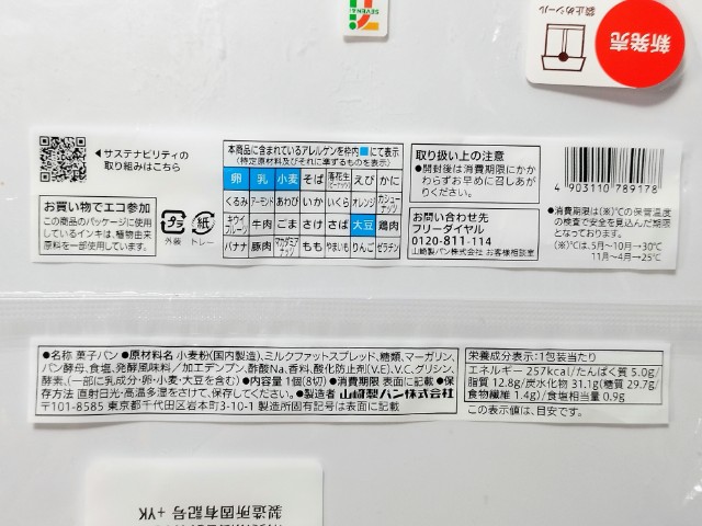 熱量:257kcal、たんぱく質:5.0g、脂質:12.8g、炭水化物:31.1g(糖質:29.7g、食物繊維:1.4g)、食塩相当量:0.9g