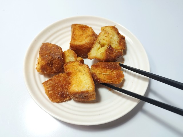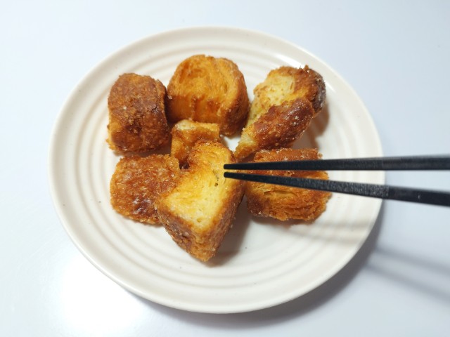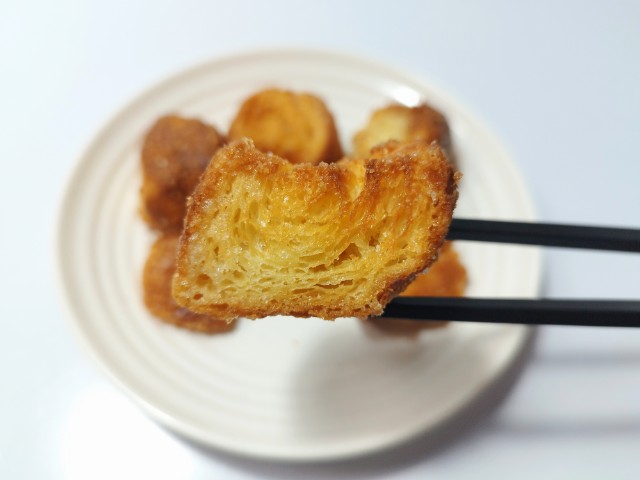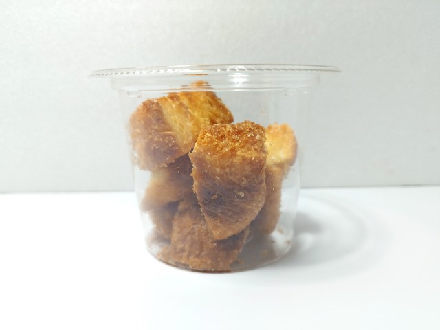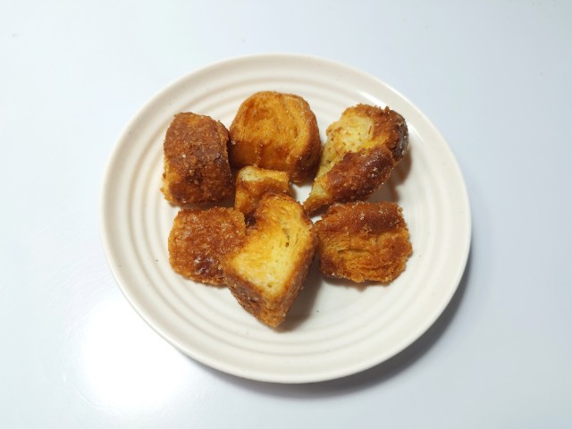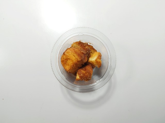 ひと口サイズラスクです。サンドイッチハンバーガーなどのチルドコーナーに売られているラスクで、見つけた瞬間に手に取ってしまいました。SNSでも「美味い…太る味」「罪深いおやつ売り始めやがった」など話題にもなっているクロワッサンラスクですが、生地サクサクとした食感バターの風味香ばしい味わいがあって、食べ出すと止まらなくなる美味しさです。個人的にラスクザクザクとしっかりとした食べ応えがあるイメージでしたが、こちらのラスクパイ生地に近い食感で、とにかく軽いのがポイントだと思います。砂糖もまんべんなくまぶされていて、甘みもしっかりと楽しめるので満足度も高いと思います。内容量は一人分にちょうどよく、おやつ小腹が空いた時にピッタリです。ぜひクロワッサンラスクを食べてみてください。