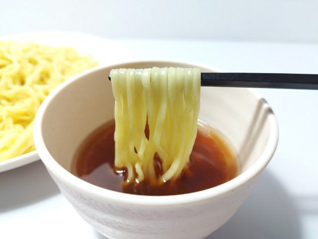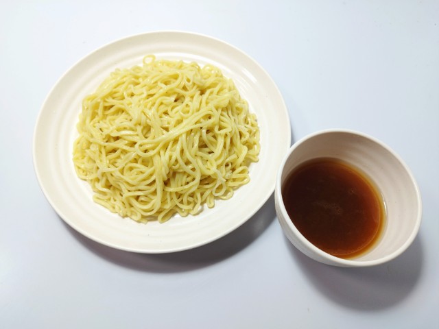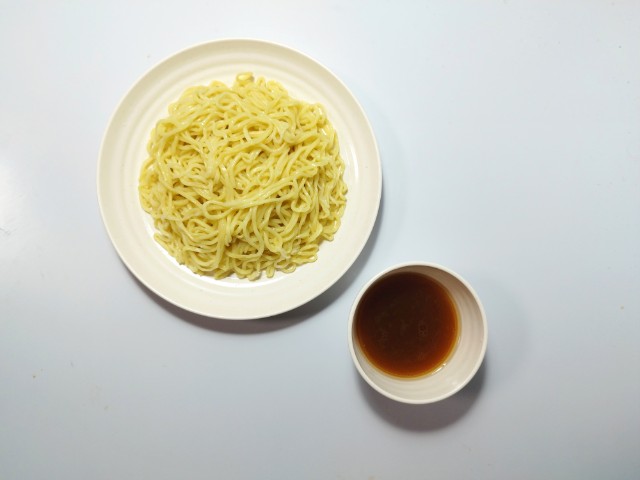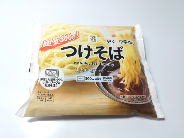 冷凍食品のつけそばです。税込213円という価格と麺量300gが気になって買ってみました。そんなつけそばの調理工程ですが、麺はレンジで500Wで約6分加熱、その間にスープを袋のままお湯につけておきます。麺が温まったら、ザルにあけて、冷水で冷やして皿に盛りつけ、スープを器に入れて80cc~100ccの熱湯を注げば完成です。ちなみにスープの濃度は80cc(濃いめ)~100cc(標準)で調整できます。実際に食べてみると、スープは魚介の旨味と醤油の風味、ほどよい酸味で、安定の美味しさです。麺はもちっとした食感と小麦の風味で、スープがよく絡みます。今回はそのまま素つけそばで食べましたが、7プレミアム ラーメン具材セット(2026年2月3日発売)や自分なりのトッピングをのせて楽しむのがベストだと思います。若干、調理の手間や容器の準備などはあるものの、長期保存や価格を考えると個人的にはコスパはかなり良いと思います。内容量は1食分にちょうどよく、お腹も満たされます。ぜひつけそばを食べてみてください。