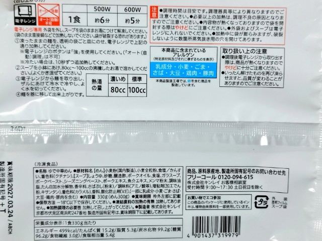 熱量:499kcal、たんぱく質:15.2g、脂質:5.3g、炭水化物:99.2g(糖質:96.2g、食物繊維:3.0g)、食塩相当量:5.4g