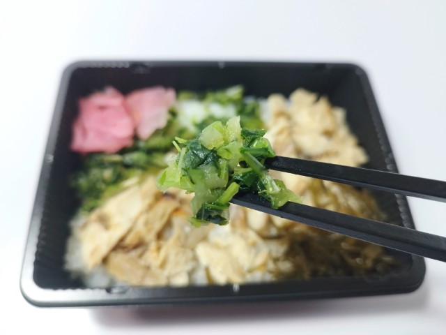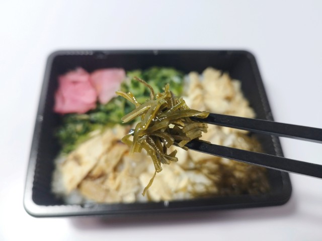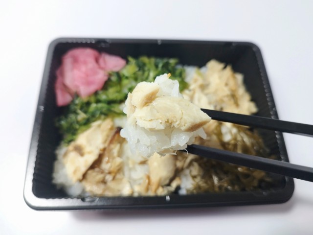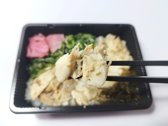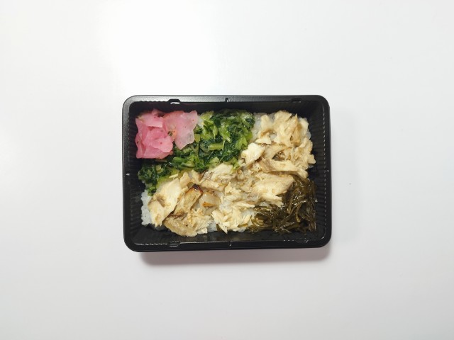 あじのほぐし身がのったお弁当です。あじを使ったお弁当で、その見た目に惹かれて買ってみました。そんなあじほぐし弁当ですが、あじのほぐし身はあじの旨味とふっくらとした身、生姜醤油の味わいがあって、ご飯が進む一品になっています。他にも細切り昆布や野沢菜漬、梅しそ大根がのっていて、味や食感のアクセントになっています。味や食感を楽しめて、さっぱりと食べられるお弁当といった感じで、食べた後の満足度も高いです。内容量は1食分にちょうどよく、お腹も満たされます。ぜひあじほぐし弁当を食べてみてください。