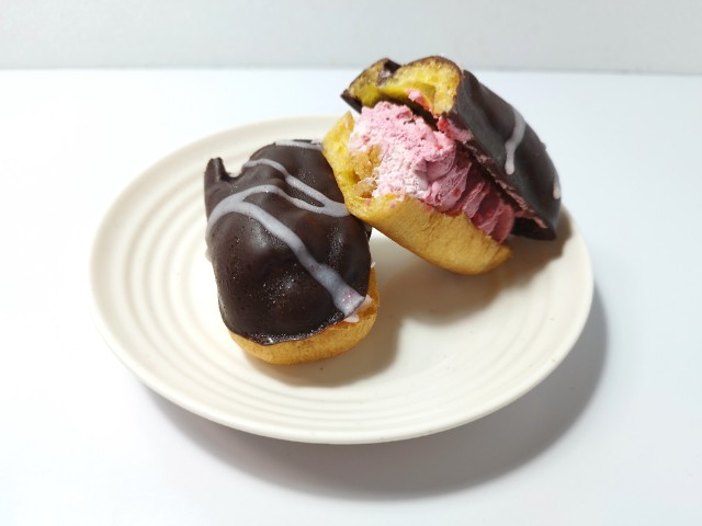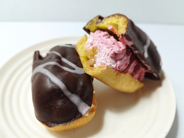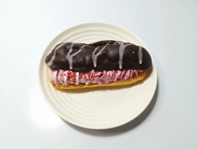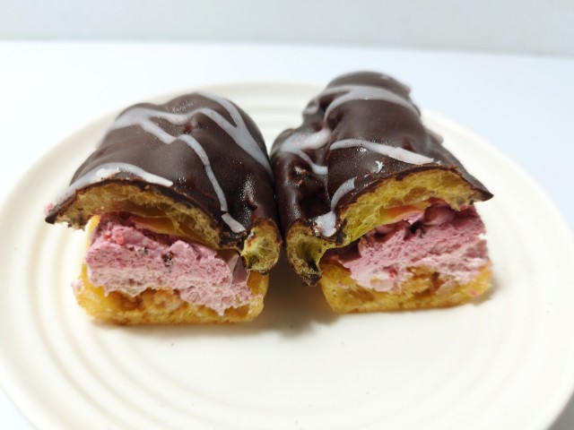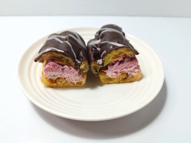 4種類のいちご具材を使ったエクレアです。以前に4種類のチョコ具材を使ったクワトロチョコエクレア(2026年1月24日発売)がありましたが、今回はいちごになっています。SNSでも「いちごクリームが美味しい」や「ちょっと食べづらい」など話題にもなっているクワトロいちごエクレアですが、生地はしっとりとした食感と歯切れの良さ、上にかかったチョココーティングはパリッとした食感とチョコの甘み、いちごグレーズはいちごの甘酸っぱさがあって、バランスの良い組み合わせになっています。中にはいちごクリームと濃いいちごクリームの2種類のクリームが使われていて、いちごクリームは練乳を使ったいちごのやさしい風味、濃いいちごクリームは冷凍いちごを使ったいちごの濃厚な味わいで、どちらもなめらかな食感ながら味の濃淡を楽しむことができます。また、2種類のいちごクリームにはいちごキャンディーチップがトッピングされていて、いちごの酸味とカリカリとした食感で、味や食感のアクセントになっています。他にもサクサク食感のビスケットが入っていたりと、最後のひと口まで飽きることなく食べられます。全体的にはいちごの味わいをしっかりと堪能できるエクレアといった感じで、満足度も高いスイーツだと思います。大きさは一人分にちょうどよく、おやつや食後のデザートにピッタリです。ぜひクワトロいちごエクレアを食べてみてください。