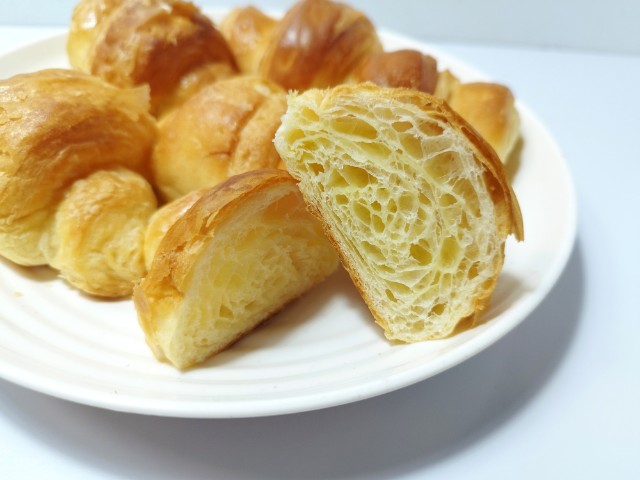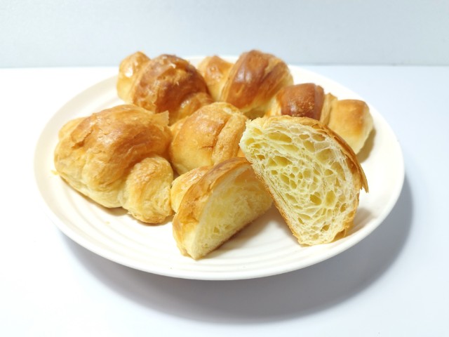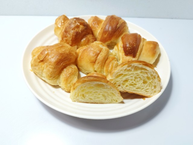 ミニスイートクロワッサンです。ミニサイズのクロワッサンで、スイートの言葉に惹かれて買ってみました。そんなミニスイートクロワッサンですが、生地はふんわりとした食感とほのかな甘み、バターの風味で、美味しいのひと言です。普通のクロワッサンと違って、甘みがあるので何もつけずとも美味しく食べられます。もちろん甘みが強いわけではないので、ジャムやフルーツなどを挟んでも美味しいと思います。6個入で1個が手のひらサイズくらいなので、一人でも食べ切れなくはないですが、シェアして食べるのがオススメです。ぜひミニスイートクロワッサンを食べてみてください。