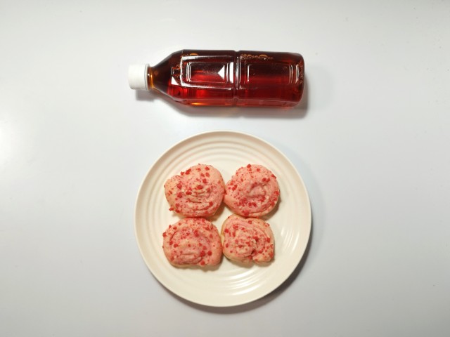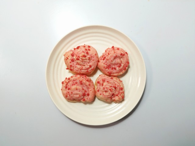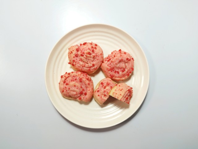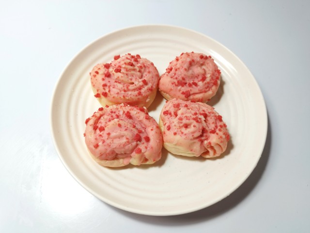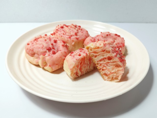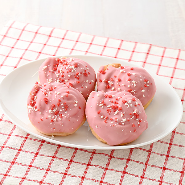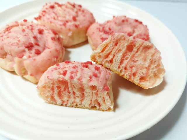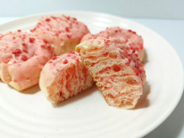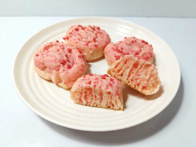 もちもちとした生地にいちごクリームを折り込んで、いちごコーチングを全面にかけ、いちごクランチとホワイトクランチをトッピングした菓子パン4個入りです。